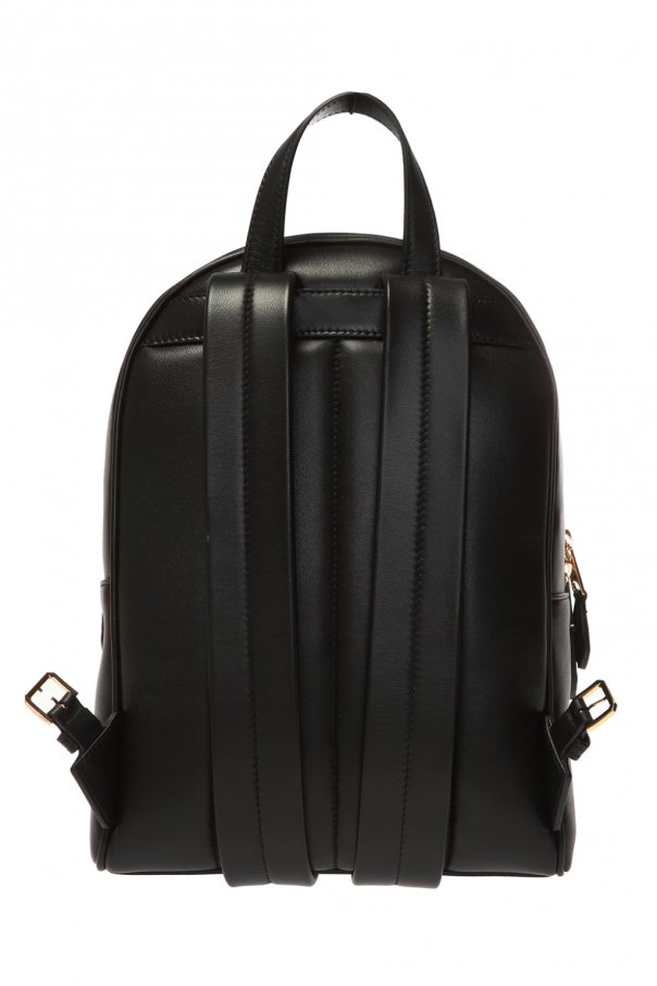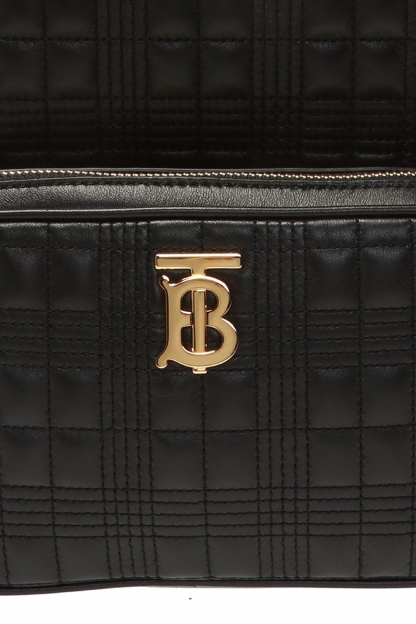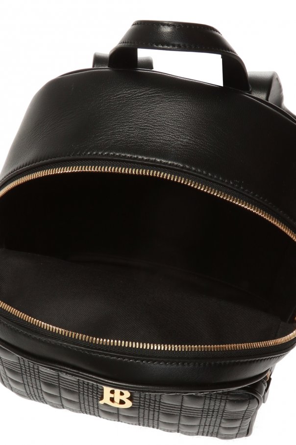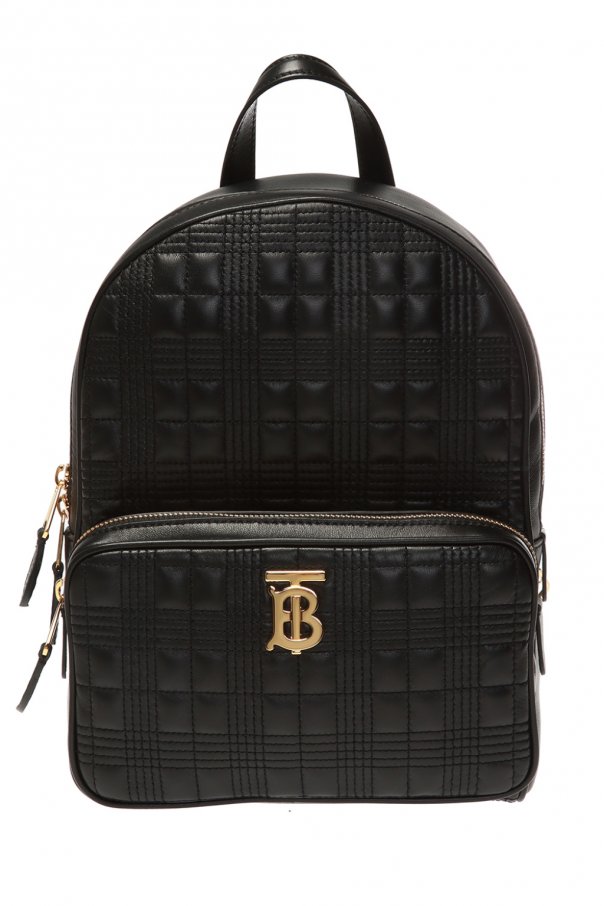 Black quilted backpack from Burberry. Made of lamb leather. Fastened via two-way zipper. Embellished with monogram metalware. Features zip pocket on the front, a half-round top handle, adjustable shoulder straps and interior with 1 compartment and 1 zip pocket inside.