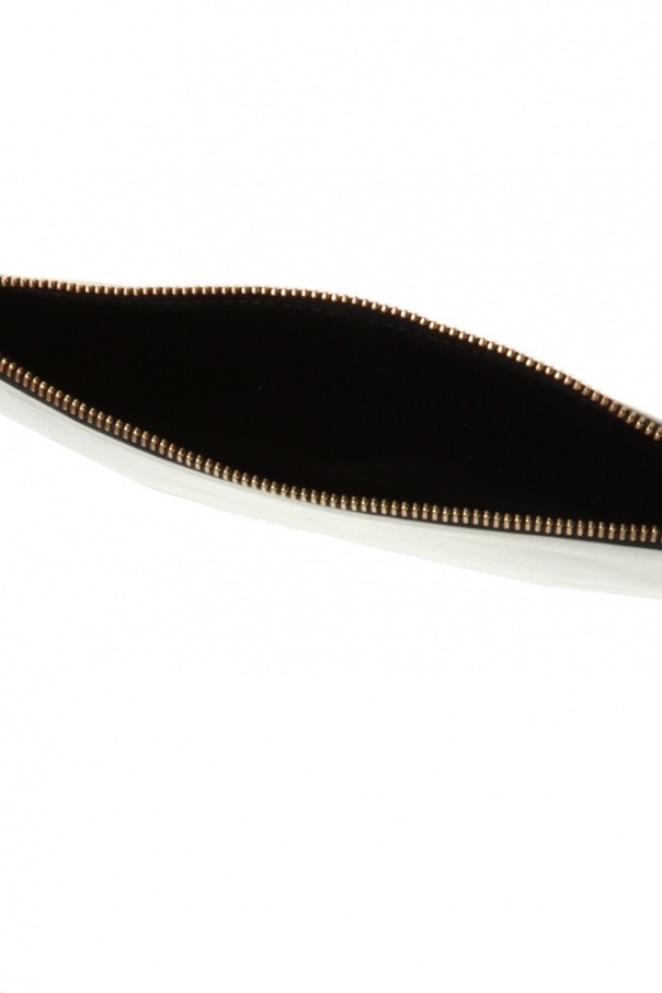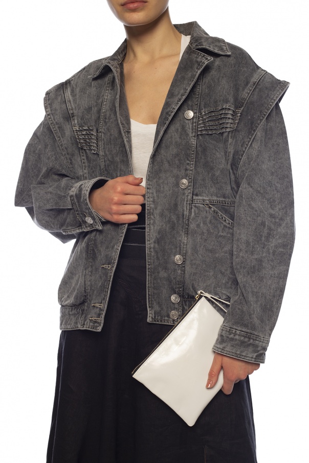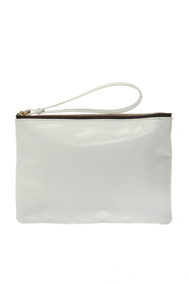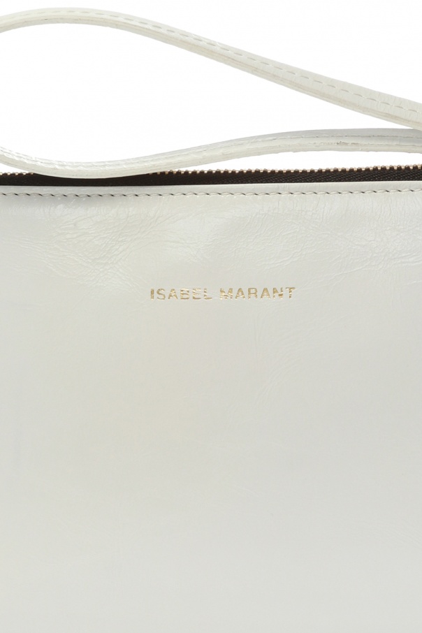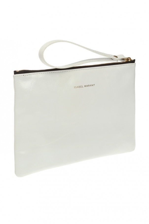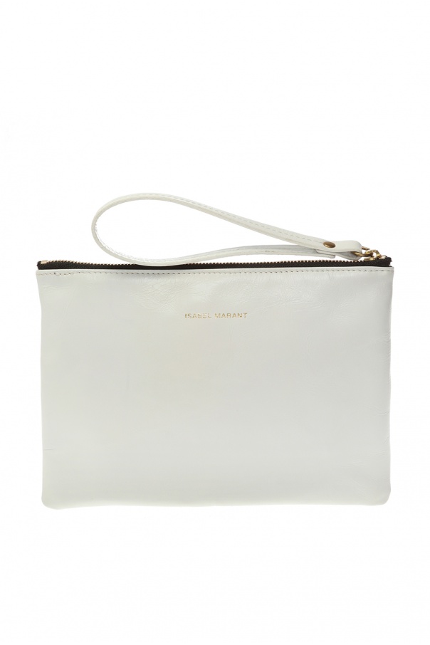 White ‘Netah’ clutch with a wrist strap from Isabel Marant. Made of bovine leather. Zip fastening. Decorated with a gold-tone logo print. Black lining. One compartment inside.