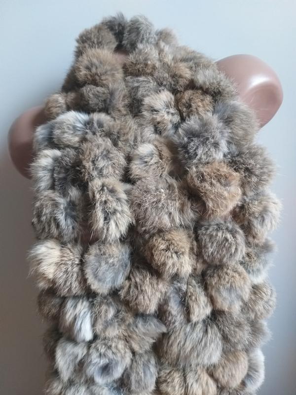 Широкий, длинный шарф из бубонов. Мех натуральный, чей - не знаю, возможно кролика. Длина 127-130 см. Ширина 13-14 см.