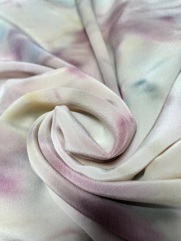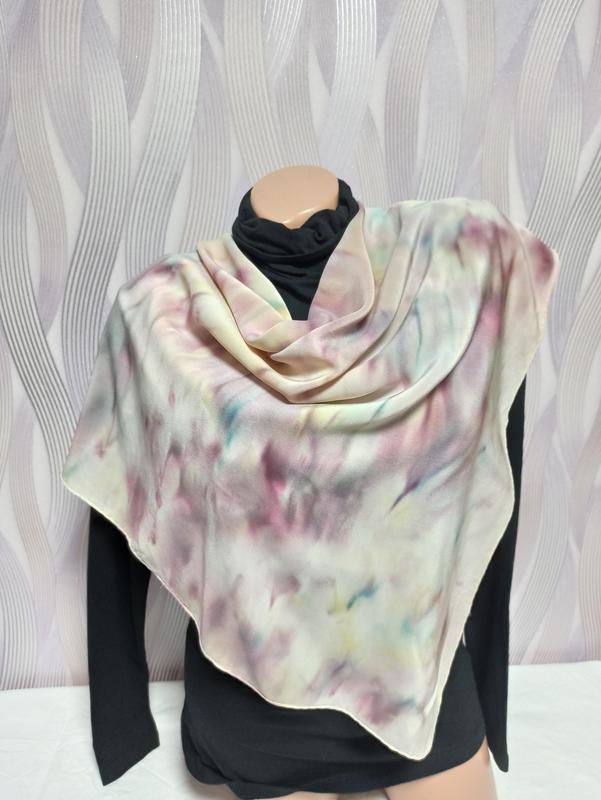 Состояние хорошее. Есть потянутые нити в нескольких местах, смотрите фото. При драпировке- нюансы не видны. 100% шелк. Шов роуль. Приятный тактильно. Материал хорошо драпируется в складки, красиво ложится. Мягкий , приятный к телу, тонкий . В разводы - окраска ручная. Размер указан в спокойном состоянии 89,5 см. Х 82,5 см.