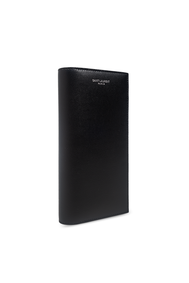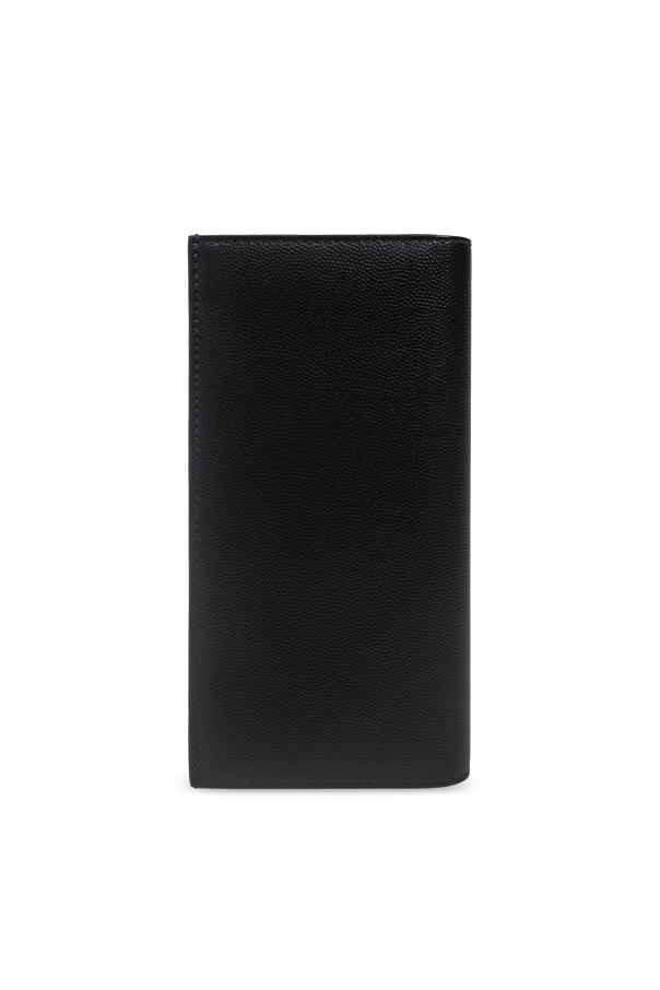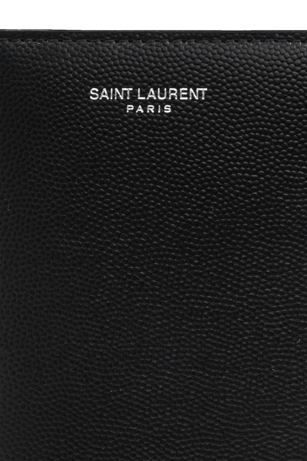 Introducing the Logo Wallet from the prestigious Saint Laurent collection. This exquisite accessory epitomizes refinement and sophistication, crafted for the discerning gentleman. The wallet boasts a sleek, rectangular silhouette, exuding an air of minimalist elegance. Made from luxurious textured calfskin leather, it is both durable and visually stunning. The black, grained surface enhances its opulent character, while the silver "SAINT LAURENT PARIS" logo prominently displayed on the front underscores its distinguished heritage. Inside, the wallet is thoughtfully designed with fourteen card slots, four slip pockets, and a secure zippered compartment, ensuring functionality and practicality without compromising on style. The classic black hue offers timeless appeal, making it a versatile addition to any wardrobe. Why Choose This Product? Exquisite Craftsmanship: Made from 100% calfskin leather, ensuring durability and a luxurious feel. Elegant Design: The rectangular, narrow form and grained texture exude sophistication. Functional Layout: Features fourteen card slots, four slip pockets, and a zippered compartment for optimal organization. Iconic Branding: Adorned with the silver "SAINT LAURENT PARIS" logo, a mark of exclusivity and prestige. Timeless Elegance: The classic black color ensures versatile styling for any occasion.
