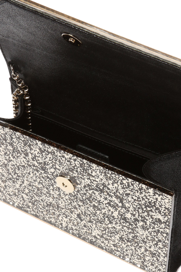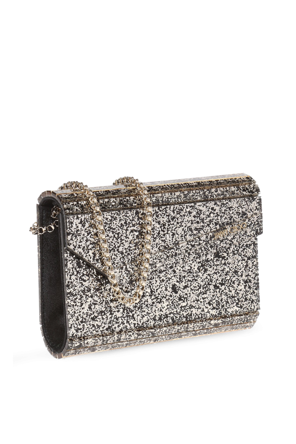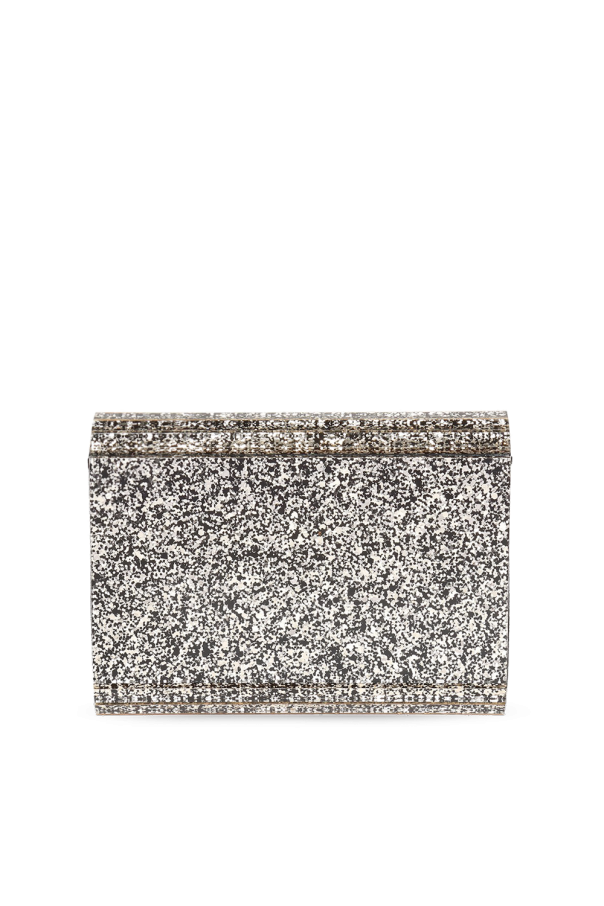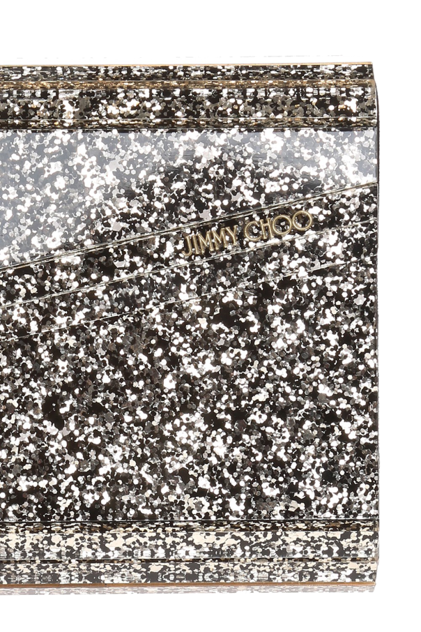 Gold-tone 'Candy' clutch from Jimmy Choo. Made of acrylic, completed with embedded glitter. Fastened with magnetic snap. Embossed logo at the front. Detachable chain shoulder strap. Black, lined interior has 1 compartment and 1 slip pocket. Gold-tone metal hardware.