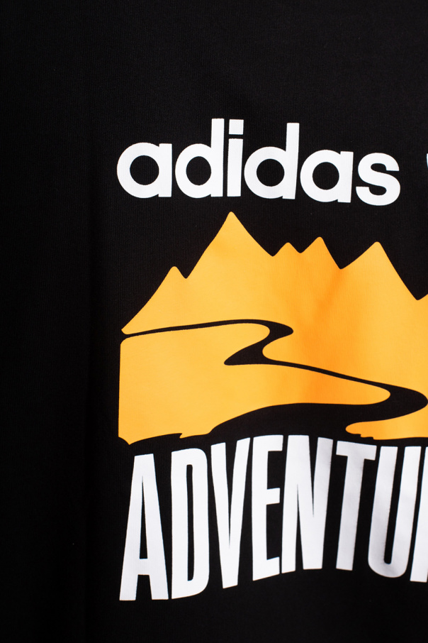 Black crewneck T-shirt from ADIDAS Originals, the ‘Adventure’ collection. Made of cotton, this style showcases a white and orange graphic print with the brand's logo.