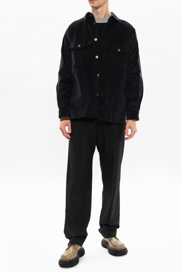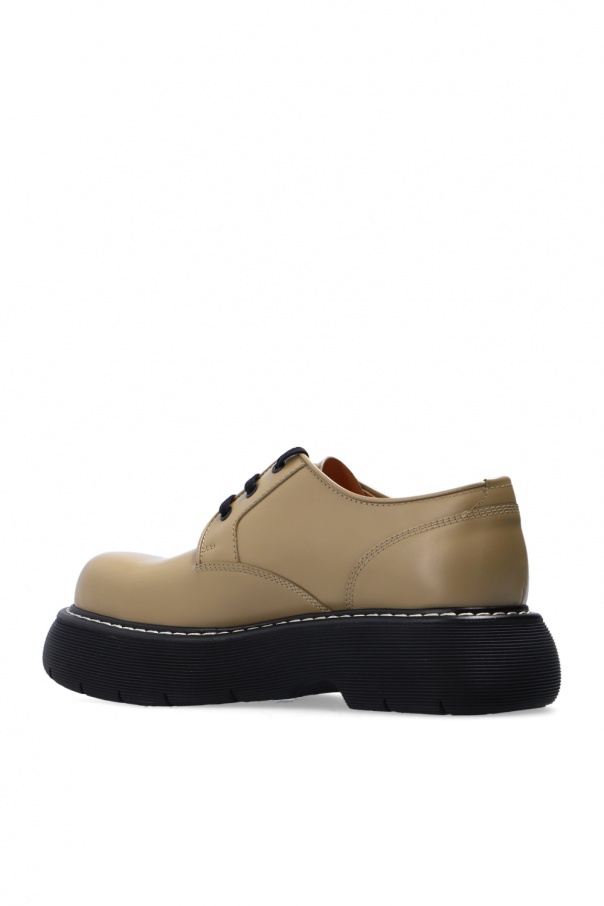 Beige and black ‘The Bounce’ platform shoes from Bottega Veneta. Crafted from calf leather, this lace-up model has white stitching details, beige lining and a black rubber sole.