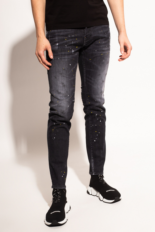 Dark grey ‘Skater Jean’ distressed jeans from ICON lbrahimović x Dsquared2. Crafted from cotton, this design features a paint splatter effect, button fastenings, five slip pockets and a black patch printed with a green logo pattern at the back. This capsule collection was created in collaboration with Swedish footballer Zlatan lbrahimović.