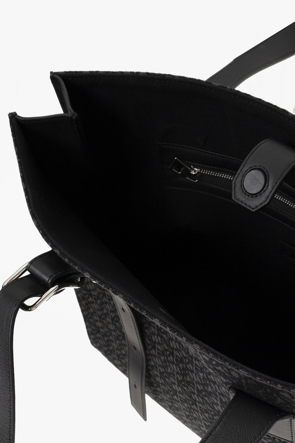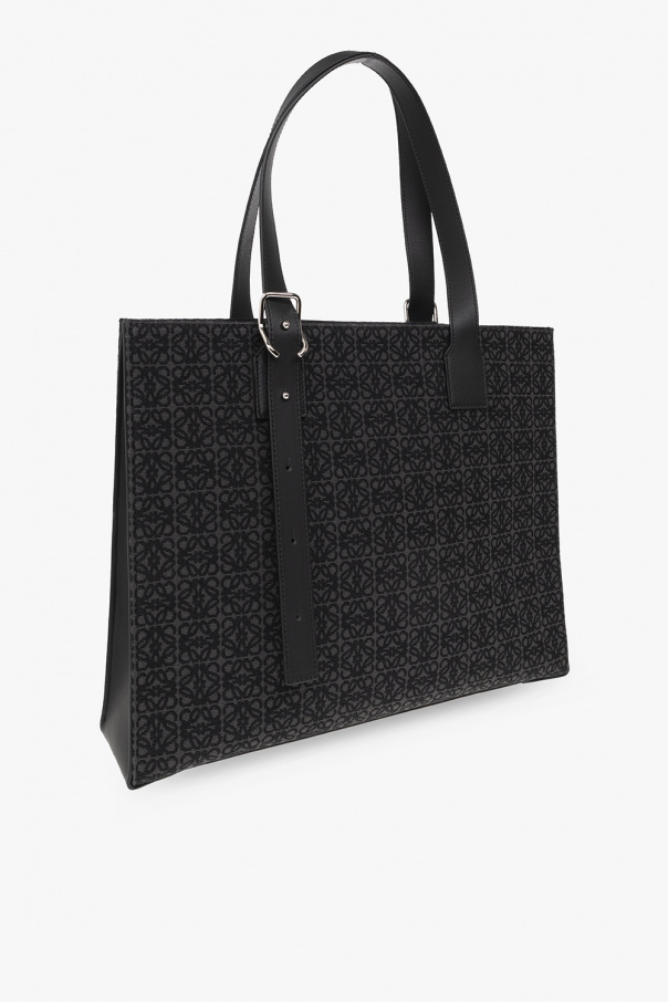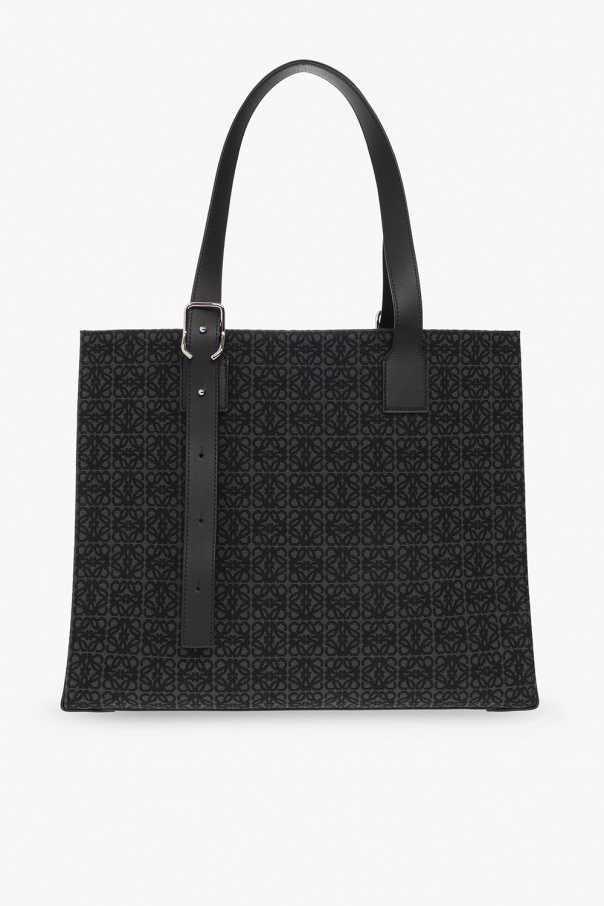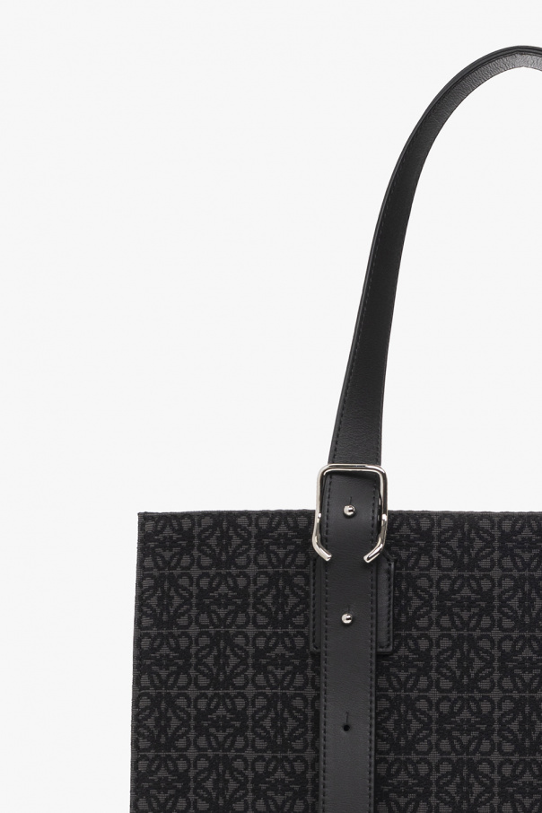 Black and grey ‘Buckle Horizontal’ shopper bag from Loewe. Made of cotton with leather trims, this model features a magnetic snap, embroidered monogram pattern, two adjustable handles, silver-tone metal hardware and one internal compartment with one zip pocket.
