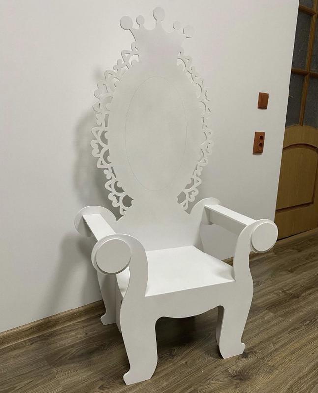 Матеріал - фанера Розмір - 110 * 64 * 35 см Колір - білий Трон їде в зібраному вигляді Крісло трон дитячий - відмінний атрибут на День Народження для вашої дитини. Відмінний вибір турботливих батьків! Стілець призначений для дітей. Дуже міцний (розраховані на вагу до 90 кг). Практичний і зручний, прослужать Вашим дітям не один рік. Стільчик-трон виготовлений з натурального матеріалу - високоякісної шліфованої фанери і пофарбований безпечної акриловою фарбою. Фарба стійка до стирання.