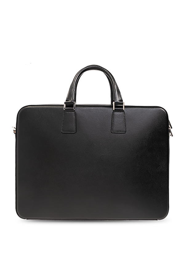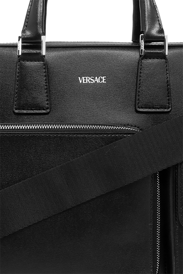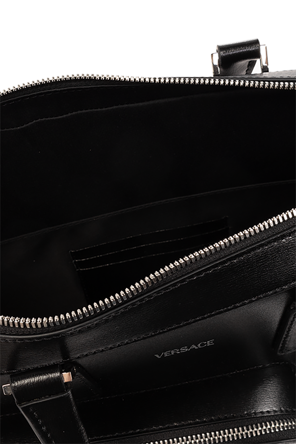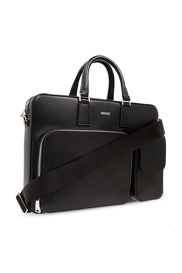 Introducing the epitome of sophistication and practicality: the Versace Black Document Bag. Crafted from the finest calfskin leather, this rectangular bag, with its subtly rounded corners, exudes a sleek, polished aesthetic. Its smooth texture and clean lines are complemented by two front pockets, secured with flaps that suggest a magnetic or similarly elegant closure, enhancing the bag's streamlined silhouette. Designed for versatility and comfort, it features short handles for carrying by hand and a broad, adjustable shoulder strap for crossbody or shoulder wear. This strap's simplicity adds to the bag's understated elegance. The front of the bag proudly displays a discreetly embossed or printed Versace logo, embodying luxury in a refined manner. Additionally, polished metal hardware accents provide a touch of brilliance, subtly highlighting its high-quality craftsmanship. The interior, lined with 100% cotton, is thoughtfully organized with additional pockets for smaller items or documents, ensuring ample space and functionality. This bag is not only a testament to Versace's renowned design prowess but also to the meticulous attention to detail that defines luxury. Why Purchase This Product? Made of premium calfskin leather for durability and elegance. Effortless organization with multiple pockets and spacious interior. Versatile carrying options with both hand and shoulder straps. Subtle Versace branding adds a touch of luxury. Polished metal accents underscore the bag's high-quality finish.