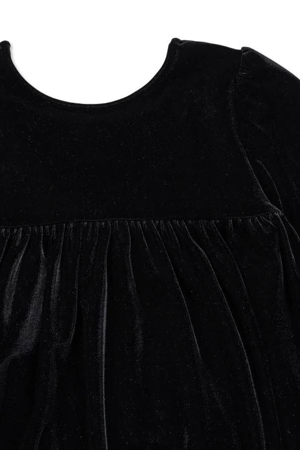 Presenting the Bow Dress from the exclusive children's collection by Konges Sløjd, an epitome of elegance and sophistication. This exquisite dress is crafted from black fabric with a velour finish, offering a luxurious allure. The standout feature is a large, red bow adorning the front, providing a charming and bold color accent. The dress boasts long sleeves with delicate ruching, enhancing its graceful aesthetic. The back features a simple cut that complements the front, while the round neckline allows the fabric to drape smoothly over the silhouette. The striking contrast between the deep black and the vibrant red bow renders this dress exceptionally stylish, perfect for special occasions. Why choose this product? Luxurious velour finish Distinctive red bow accent Graceful ruching on sleeves Expert craftsmanship by Konges Sløjd Sustainable materials with recycled polyester