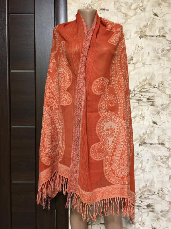 Бесподобный тончайший палантин с набивным орнаментом!!!Судя по всему вещь новая,бирка производителя и состав сняты,но и без того видно,что это натуральная шерсть,похоже,что без примесей,чистая!!!