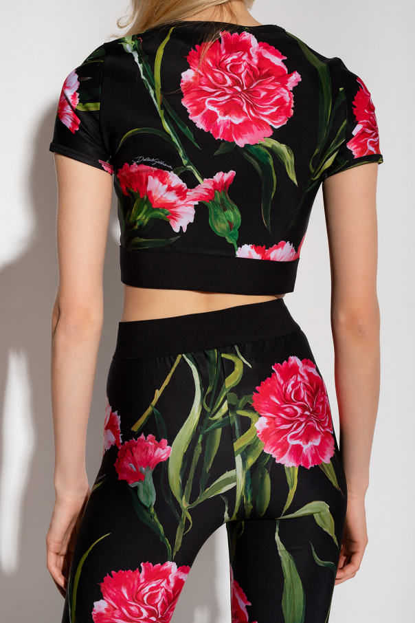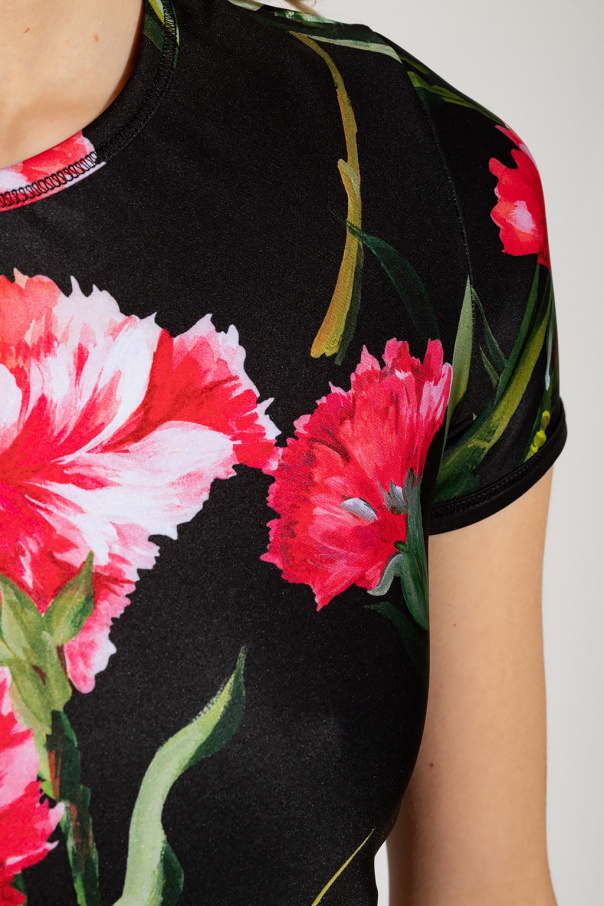 Short, black top from Dolce & Gabbana. This short sleeve design features a multicolored floral print, round neck and elasticated hem embroidered with a white logo.