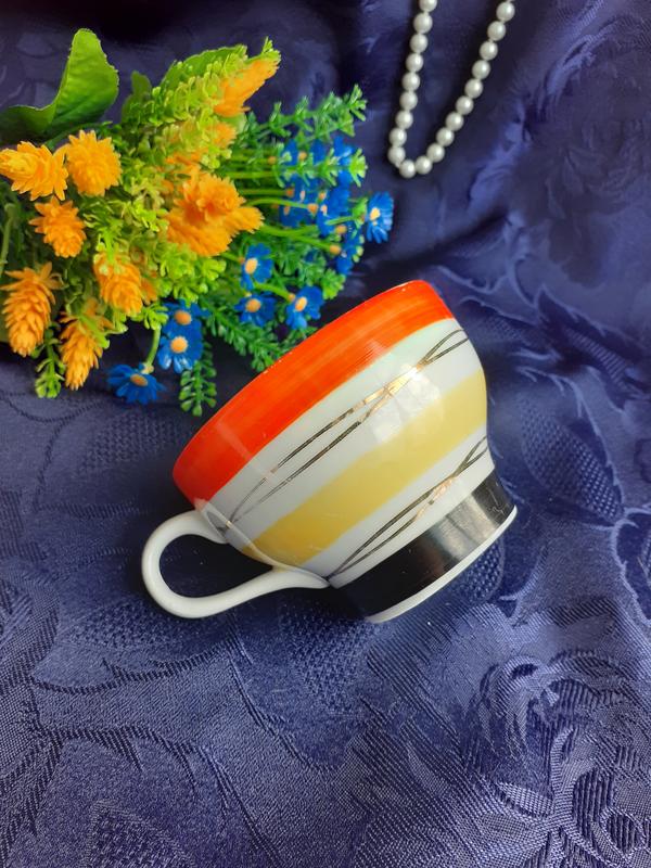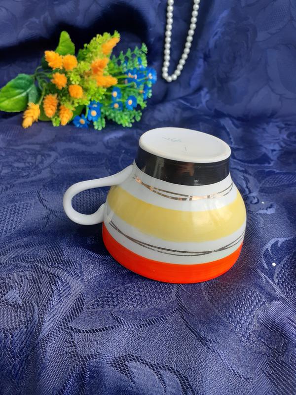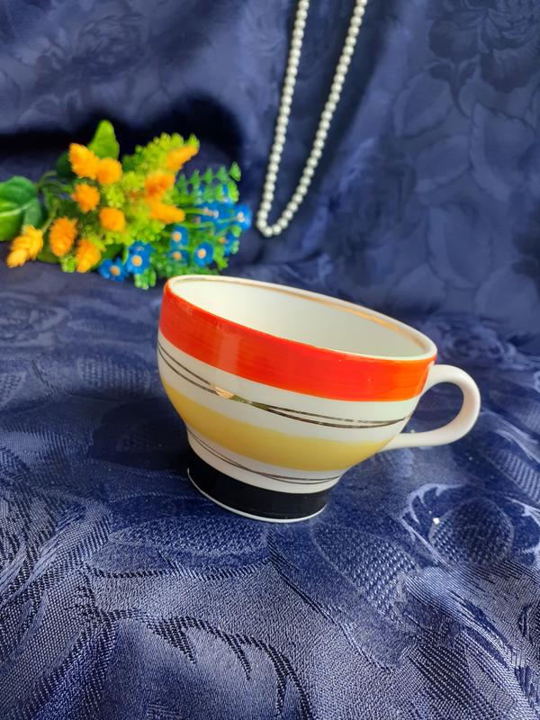 «Полосатость» на фарфоре - истинные 1960-е! Минимализм во всём! Три цвета, скудность рисунка, созвучного эпохе, - просто, но с каким вкусом! Уже более 60 лет прошло, а использовать в быту предметы
