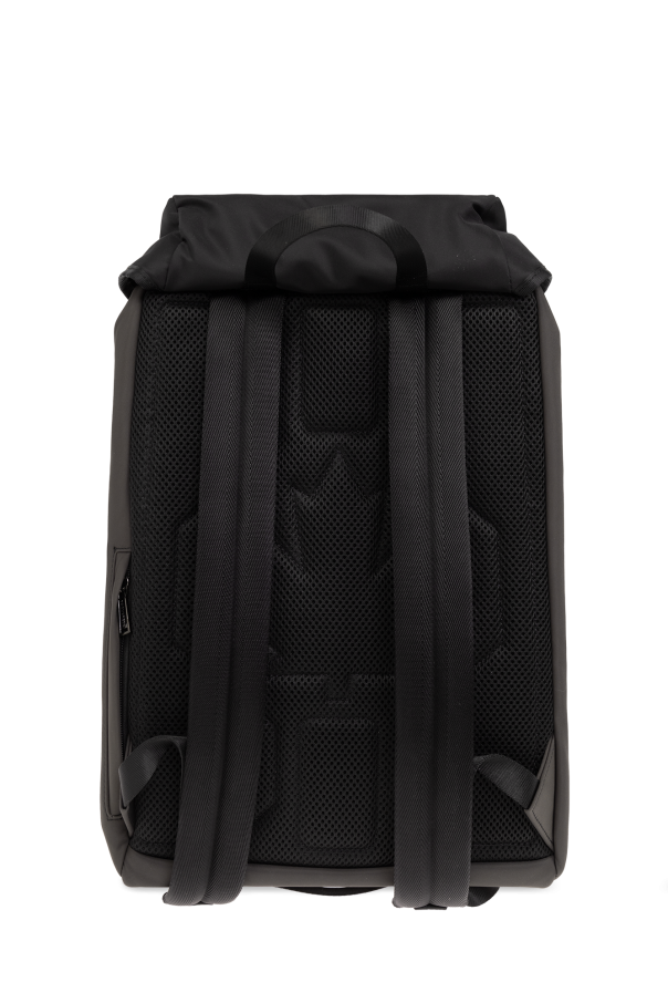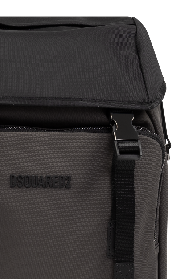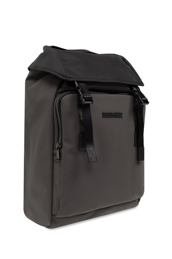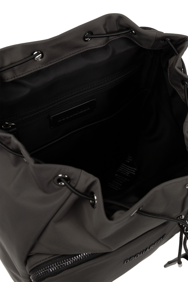 Dark grey backpack from Dsquared2. Embellished with a black logo application, this design fastens via buckles on the flap and features a half-round handle, adjustable shoulder straps, silver-tone metal hardware and a drawstring internal compartment with one slip pocket and one zip pocket.