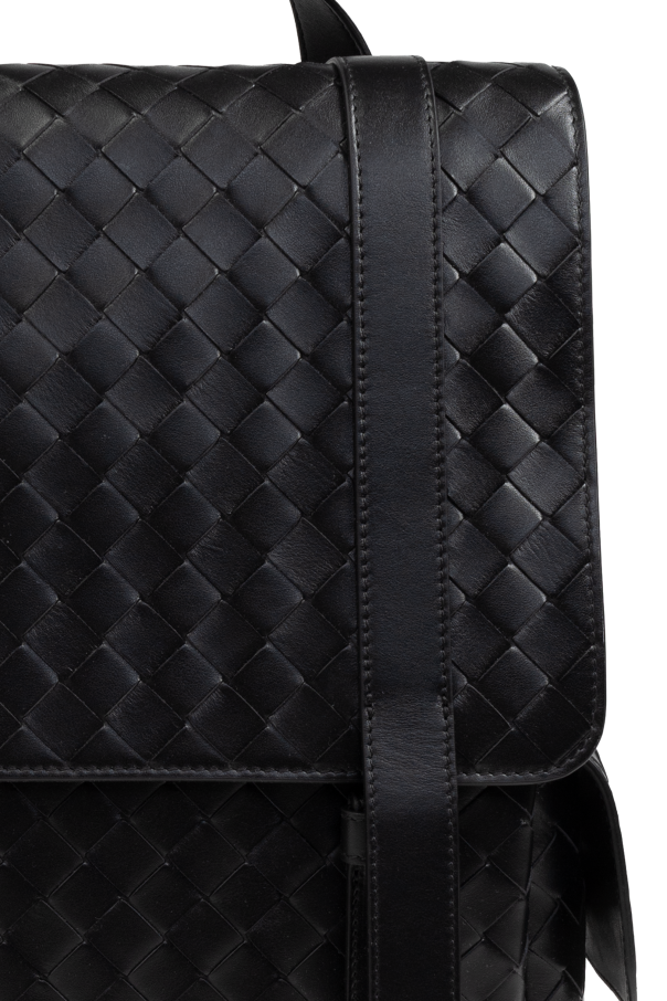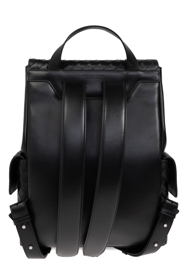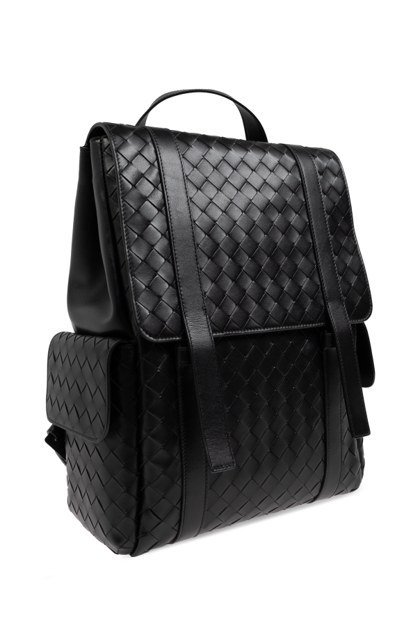 Introducing the Leather Backpack from the exclusive collection by Bottega Veneta, a creation that epitomizes elegance and functionality. This rectangular backpack, crafted from premium black leather, boasts a distinguished woven pattern on the front, exuding a luxurious aesthetic. The backpack features a robust construction with a clear division between the front and back. Its glossy leather exterior is not only visually striking but also highly durable. The flap closure, secured by two vertical leather straps, adds a touch of sophistication. Designed for comfort and convenience, this backpack includes a handy top handle for carrying and wide, adjustable shoulder straps. Side pockets with snap closures enhance its practicality, while the spacious main compartment and three slip pockets inside provide ample storage. The interior, lined with a light-colored material, offers a refined contrast to the black exterior. Ideal for both everyday use and special occasions, this backpack seamlessly blends luxury and utility. Why Choose This Product? Superior quality black leather with a glossy finish Elegant woven pattern for a luxurious appeal Spacious main compartment with additional slip pockets Comfortable, adjustable shoulder straps Designed by the esteemed Bottega Veneta