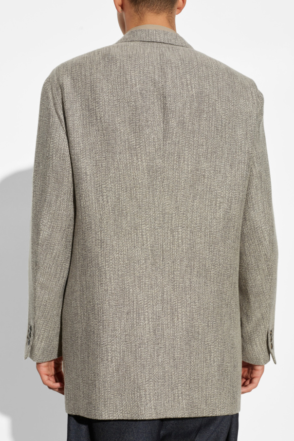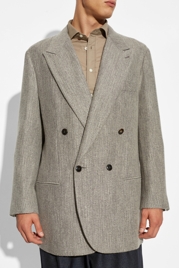 Product Name: Double-Breasted Blazer Category: MEN, Clothing, JACKETS, BLAZERS Dominant Color: Gray Introducing the epitome of sartorial elegance – the Double-Breasted Blazer. Meticulously crafted by the illustrious designer Giorgio Armani, this blazer embodies luxury and sophistication. The blazer features a classic double-breasted design with wide, distinguished lapels that exude a formal charm. Constructed from a high-quality fabric blend, including viscose, wool, polyamide, and cashmere, it promises both comfort and durability. The subtle, intricate pattern enhances its unique appeal, making it a standout piece in any wardrobe. Four dark-colored buttons adorn the front, with two functional ones, offering a striking contrast against the light gray fabric. The blazer boasts two external flap pockets and a breast pocket on the left side, providing both style and practicality. The sleeves are elegantly finished with three small buttons, adding a touch of class. The interior is lined with a smooth acetate and cupro blend, ensuring a comfortable fit. The straightforward, slightly relaxed cut makes this blazer versatile, suitable for both formal events and more casual outings. The minimalist yet sophisticated design is accentuated by the absence of additional seams or cuts on the back, highlighting its refined craftsmanship. Why Purchase This Product? Exclusive design by Giorgio Armani Luxurious fabric blend for comfort and durability Classic and versatile style Exquisite detailing with functional and decorative buttons Elegant and practical pocket design Smooth interior lining for enhanced comfort