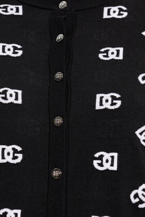 Black cardigan from Dolce & Gabbana. Embellished with a monogram pattern, this style fastens with buttons and features ribbed trims on the round neck, bottom hem and long sleeves.