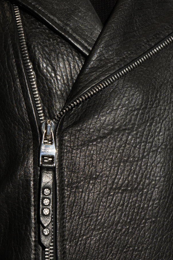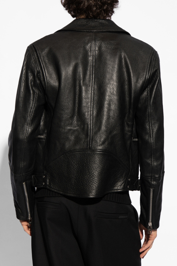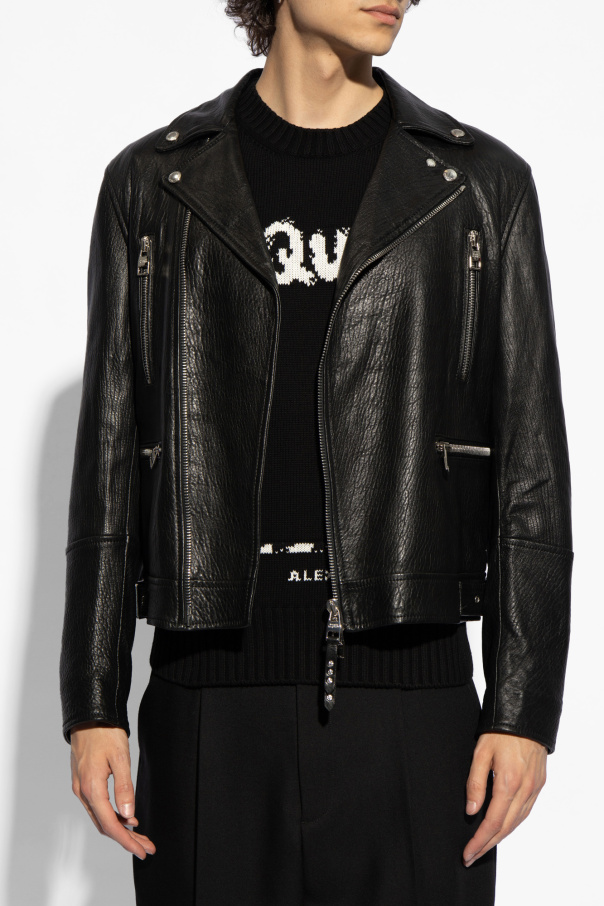 Black biker jacket from Alexander McQueen. Crafted from lamb leather, this style has two-way zip closure, four zip pockets on the front, buckle tabs for adjustable fit on the sides and long sleeves with zipped cuffs.