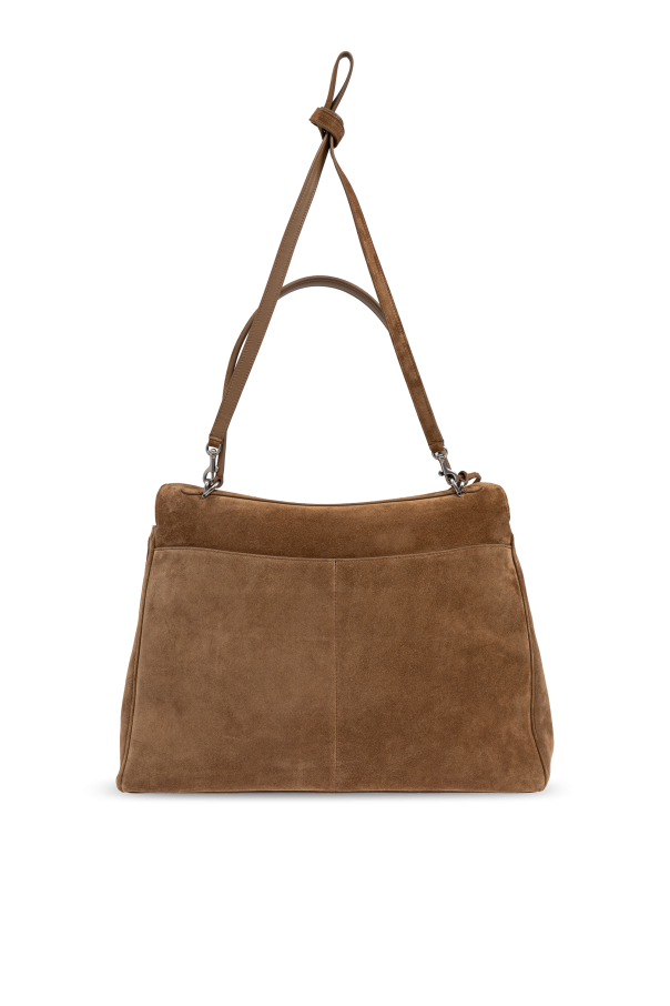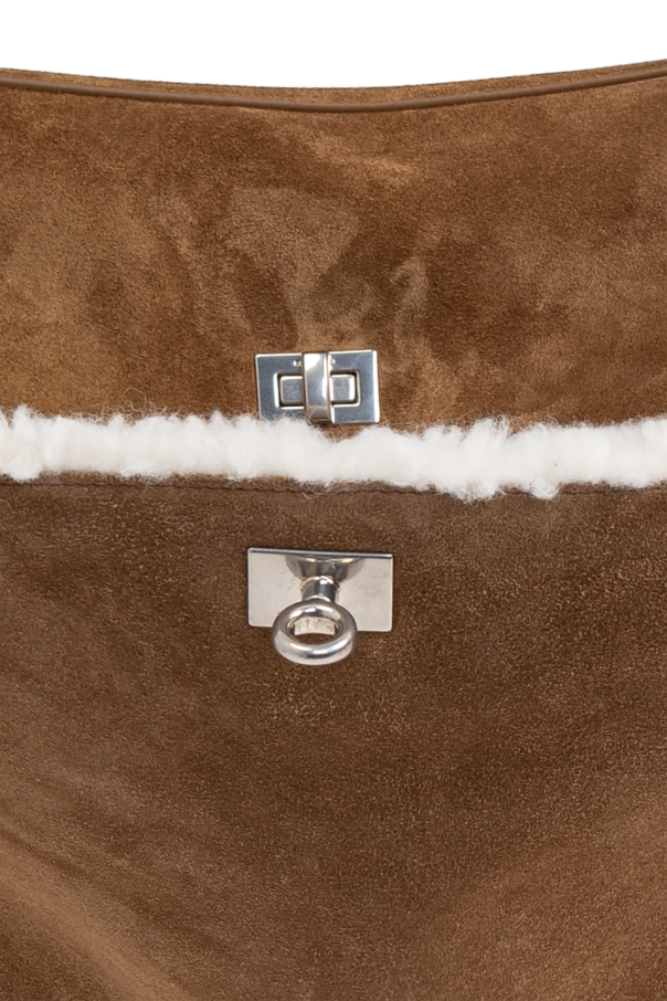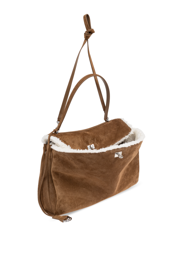 Introducing the exquisite Shopper Bag from the exclusive Balenciaga collection, a masterful blend of style and functionality. Crafted with a sophisticated rectangular silhouette, this bag showcases luxurious brown suede, accentuated with opulent silver-toned metal clasps, enhancing its elegance. The interior, artfully lined with a plush fur-like white fabric, offers a spacious haven with two compartments and an additional zippered pocket for enhanced organization. The adjustable strap allows for versatile wearing options, ensuring comfort and chic adaptability. Blending timeless allure with modern practicality, this shopper bag is an ideal accompaniment for your daily endeavors. Its rich hues and exquisite materials, including acrylic, leather, wool, and polyester, embody the essence of Balenciaga's legacy under the creative direction of Demna Gvasalia. Why Choose This Product? Timeless design by the renowned Balenciaga. Luxurious materials and meticulous craftsmanship. Spacious interior with two compartments. Elegant silver-toned metal accents. Adjustable strap for versatile wear.