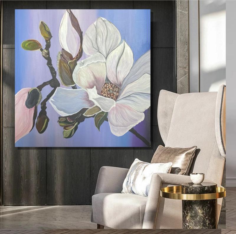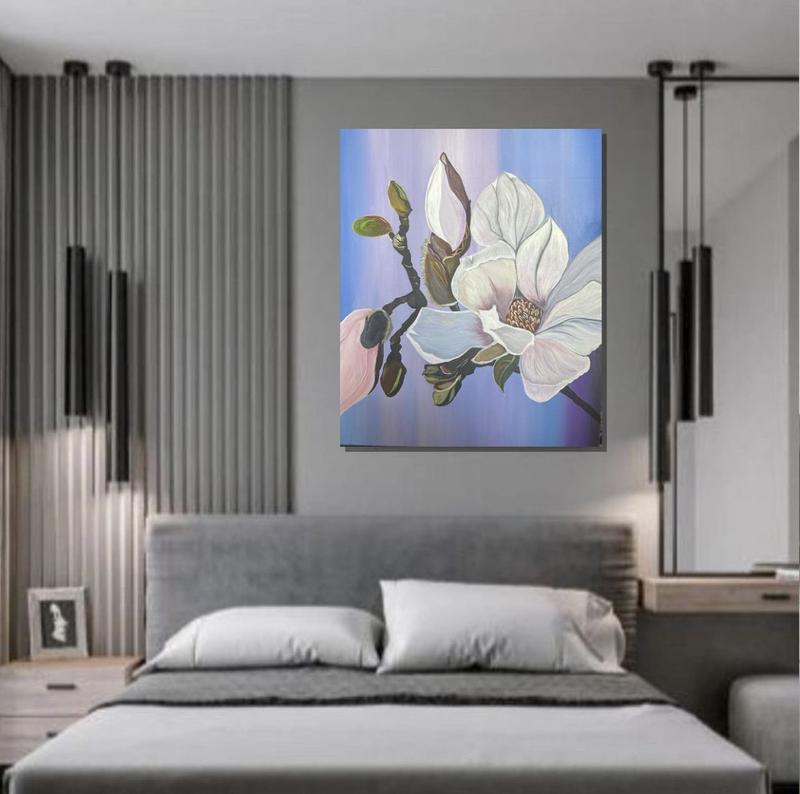 На картине изображена красивая магнолия на сине-розовом фоне. Очаровательный цветок магнолии привлекает внимание своей нежностью и изящностью. Его густые лепестки, окрашенные в прекрасные оттенки розового и белого, создают красивый контраст с фоном. Бутон магнолии еще не полностью раскрыт, позволяя зрителю увидеть его элегантную форму. Вокруг цветка можно заметить нежные лепестки, уже упавшие на землю, создавая впечатление легкой и романтичной атмосферы. Сине-розовый фон добавляет картины некую загадочность и дополняет красоту магнолии. Общий эффект картины пленит зрителя своей красотой и нежностью, заставляя нас остановиться и насладиться этим прекрасным произведением искусства.
