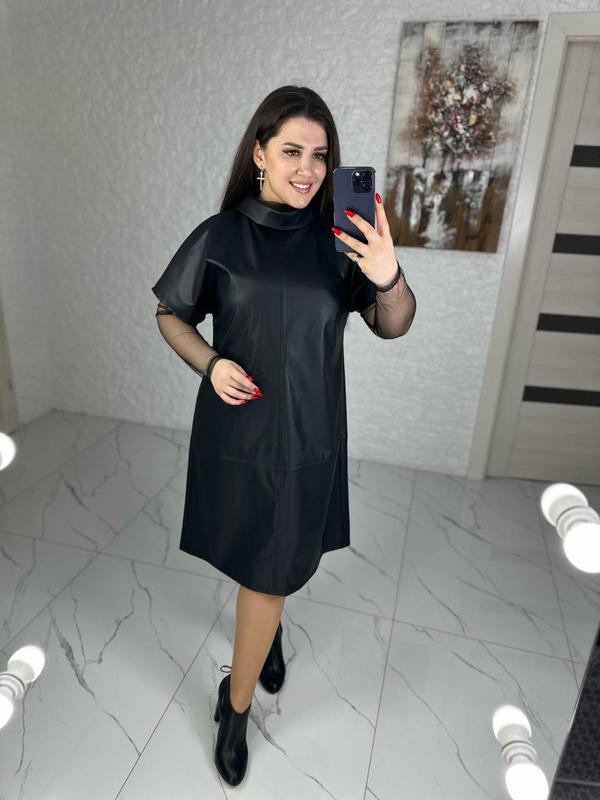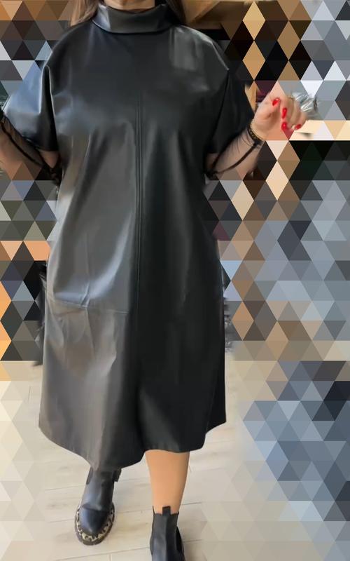 Вільне плаття , трапецією , оздоблена цікавими швами, ворот -стійка, короткий рукав, по спинці молнія з подвійним бігунком; гольф з довгим рукавом , не висока горловинаЗаміри виробу :