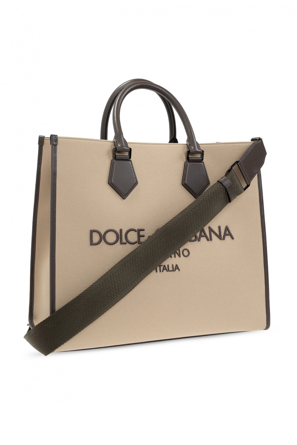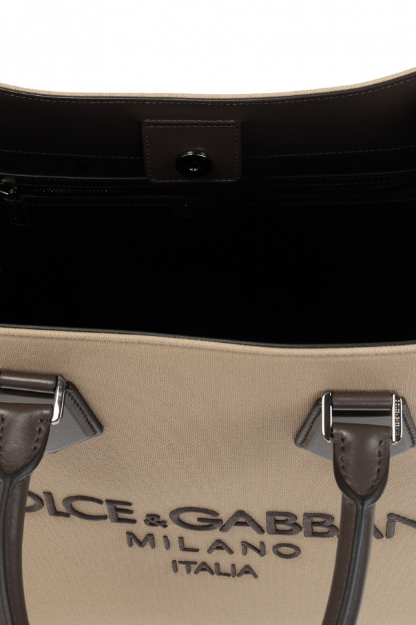 Beige and brown ‘Edge’ shopper bag from Dolce & Gabbana. Crafted from canvas with calf leather trims, this style fastens with a magnetic snap and is decorated with a logo embroidery, two half-round handles, detachable and adjustable straps, grey metal hardware and one internal compartment with one zip pocket and two slip pockets.