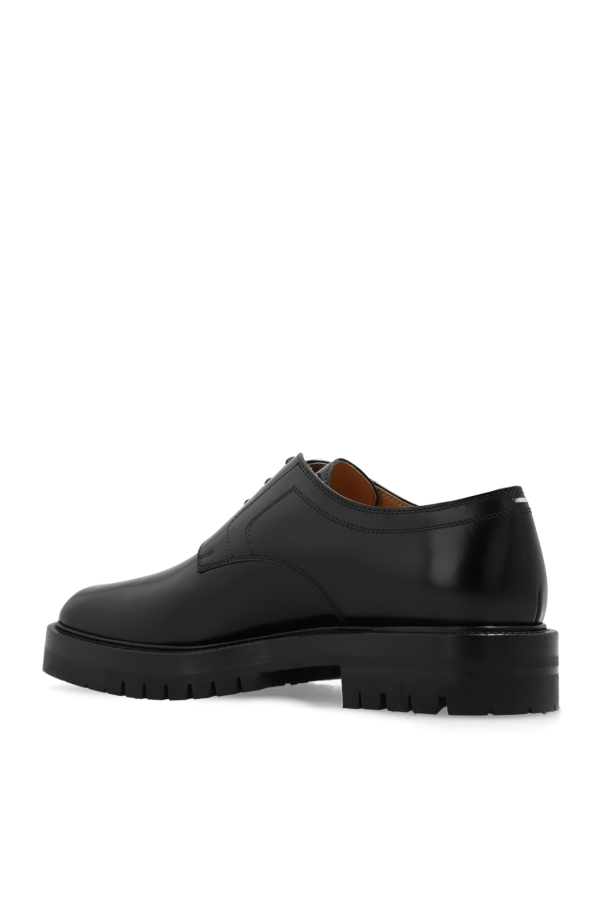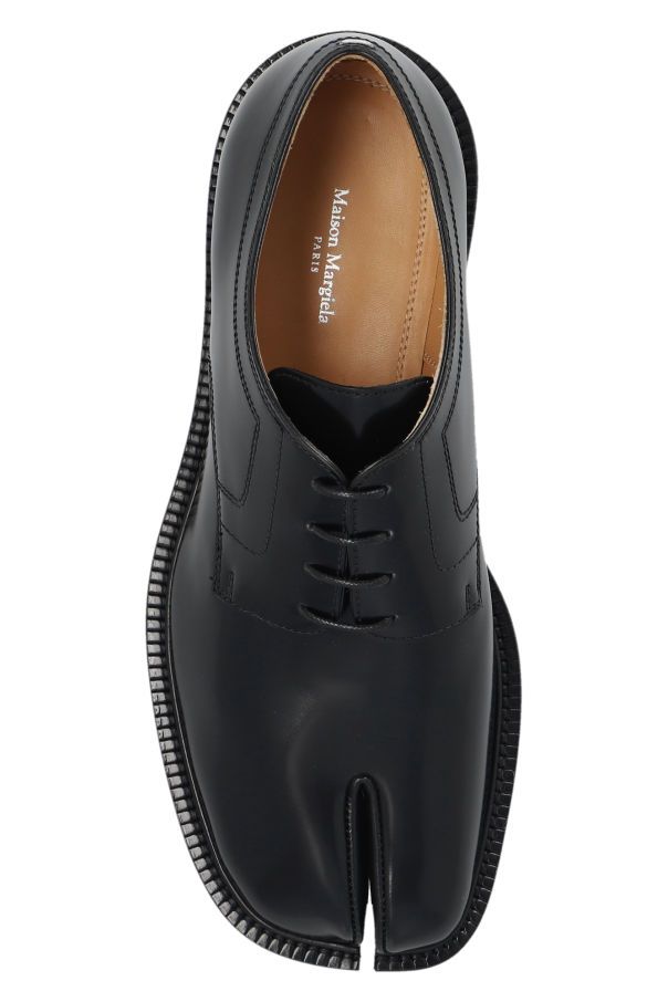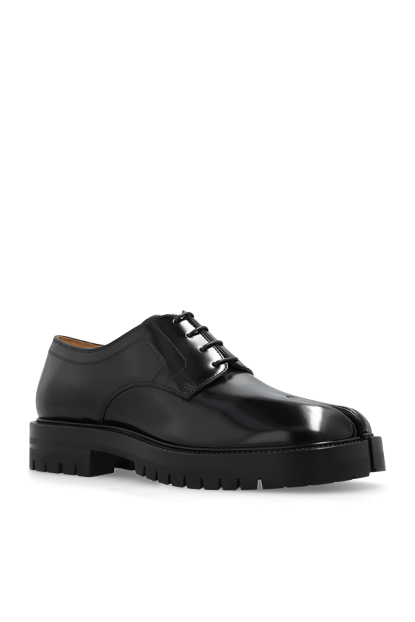 Black Derby shoes from Maison Margiela. Made of smooth patent leather, this lace-up model sits on a black rubber sole and showcases the iconic ‘Tabi’ split toe.