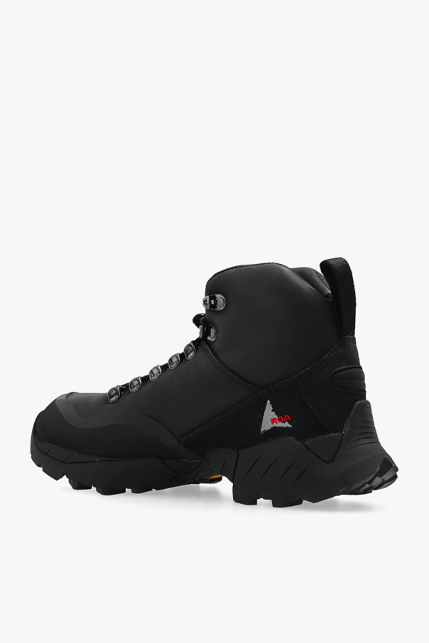 Black ‘Andreas’ trekking boots from Roa. Featuring a Kudu leather upper which provides a unique combination of softness and strength, this model is complete with lace-up fastenings, logo detailing, rubber trims and a black Vibram Megagrip toothed tread pattern sole designed for optimal traction and to ensure high resistance to use on roughest surfaces.