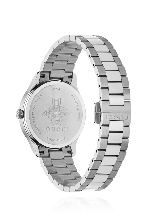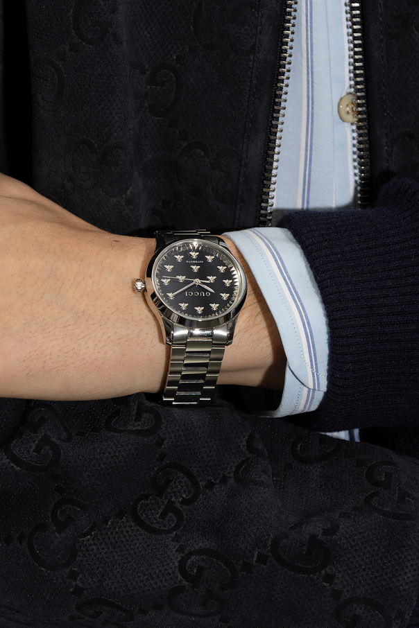 Silver-tone and black ‘G-Timeless’ automatic watch from Gucci. With a 32mm steel case, this model features an onyx dial enriched by the brand's signature engraved bee and logo, sapphire glass with antireflective coating and a steel bracelet with a branded fastener.