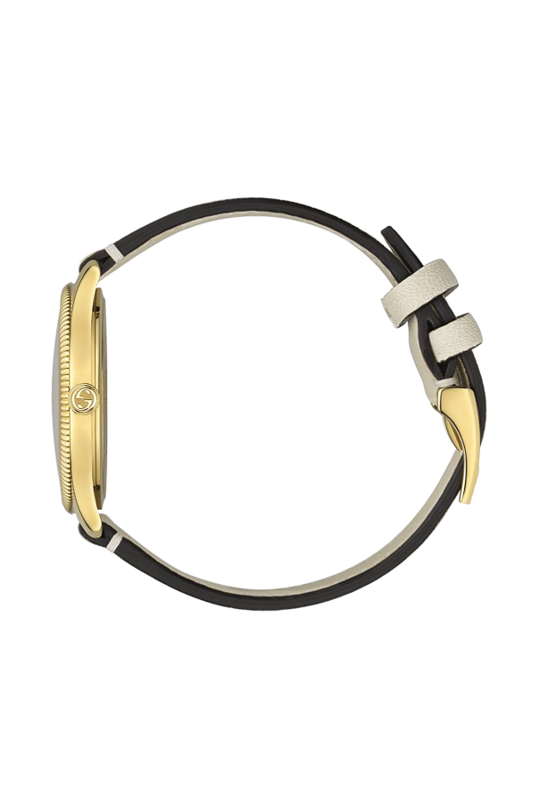 Cream and gold-tone ‘G-Timeless’ watch with a leather strap from Gucci. Crafted in the Swiss Kering watch manufacture, it is characterized by an innovative 36mm case, the brand's iconic bee that appears as a subtle detail on one of the watch's hands, sapphire glass with antireflective coating and polished and satin steel finish.