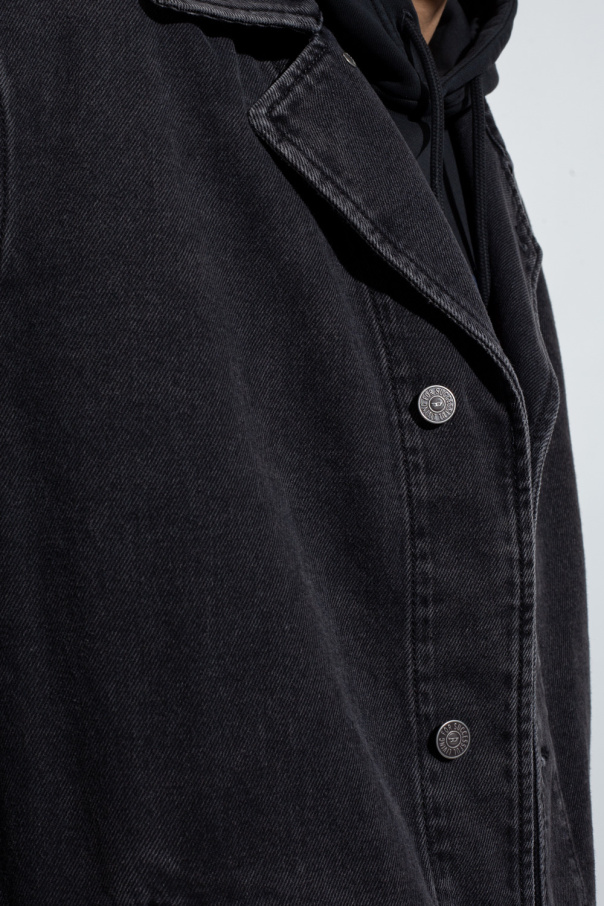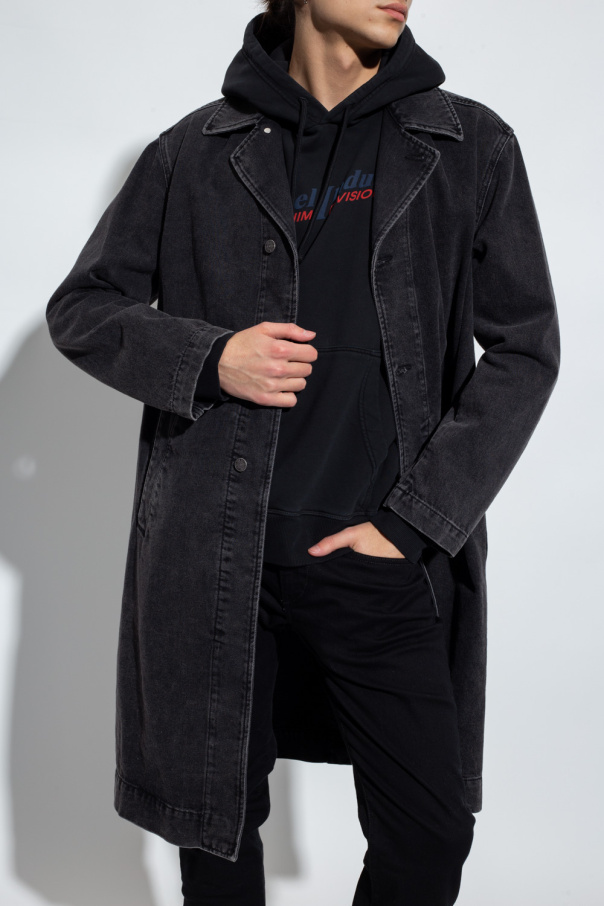 Dark grey ’Roku’ denim coat from Diesel. Made of cotton, this style features button fastenings, two slip pockets, long sleeves and a back vent with a button closure.
