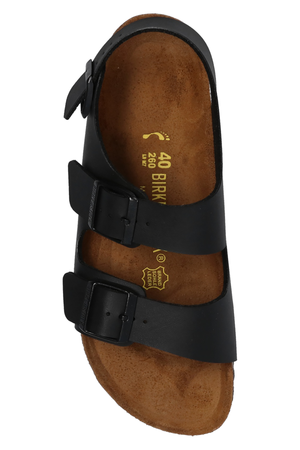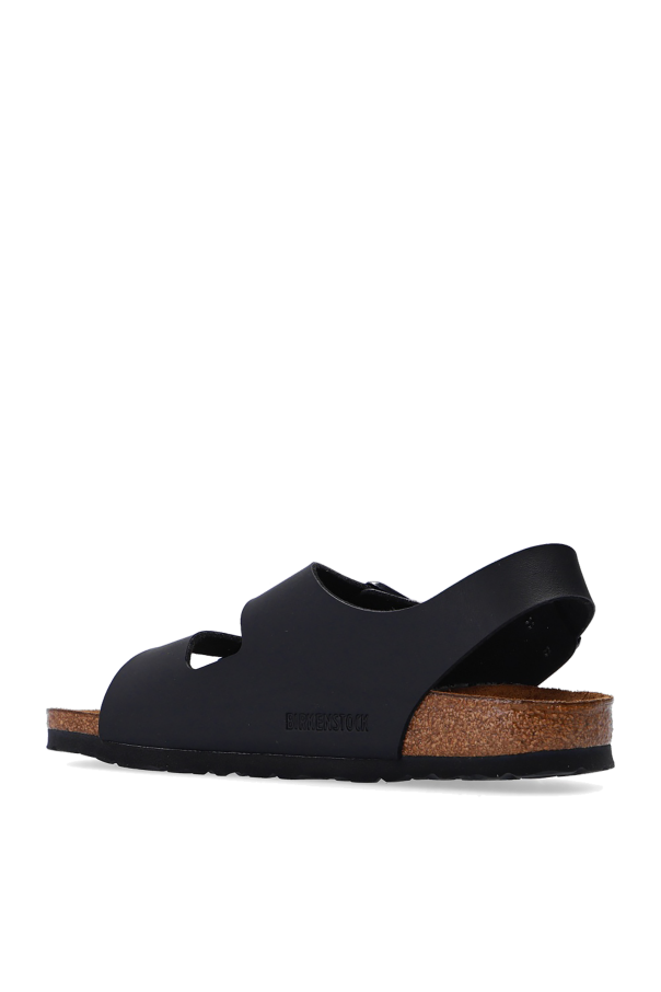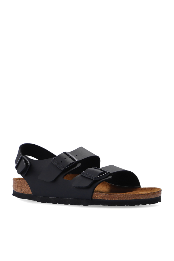 Black ‘Milano BS’ sandals from Birkenstock. Sitting on a black rubber sole, this model features a standard width upper and straps with logo-embossed buckles in gold-tone.