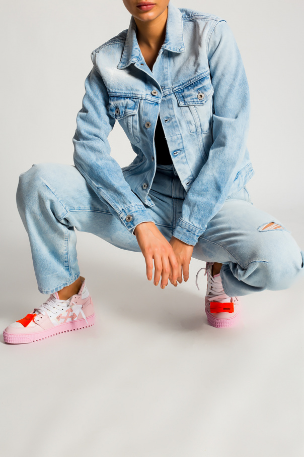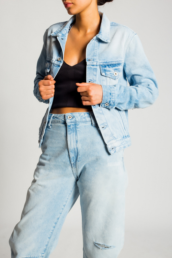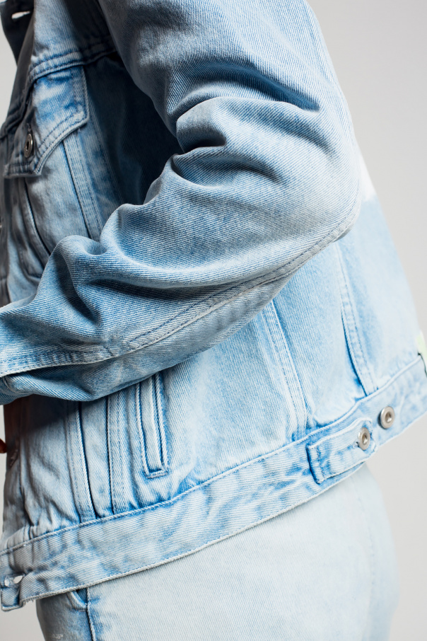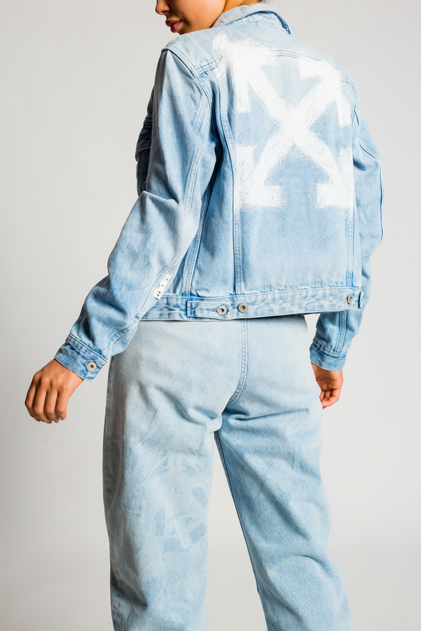 Light blue denim jacket from Off-White. Printed with the brand's logo in white, this style features button fastenings, long sleeves, two welt pockets and two flapped pockets with buttons.