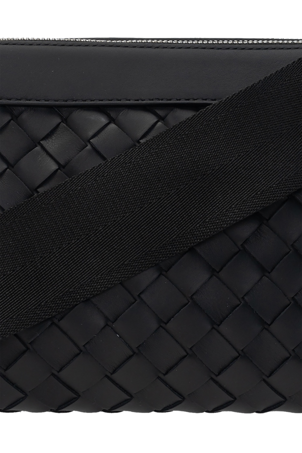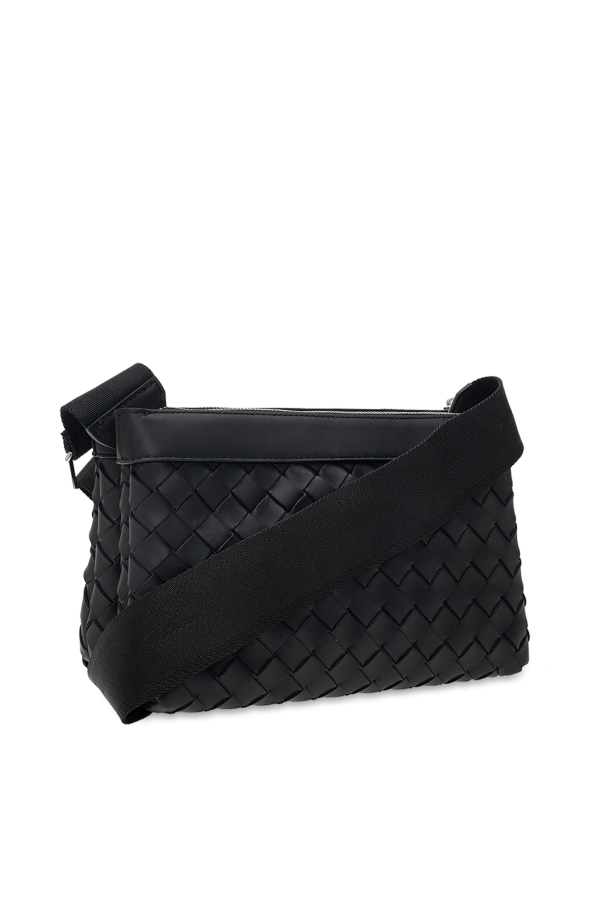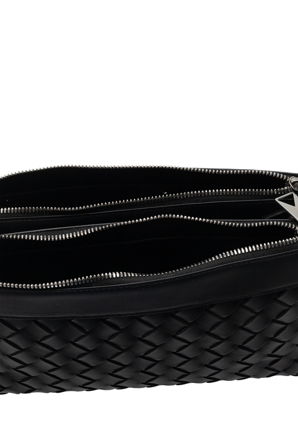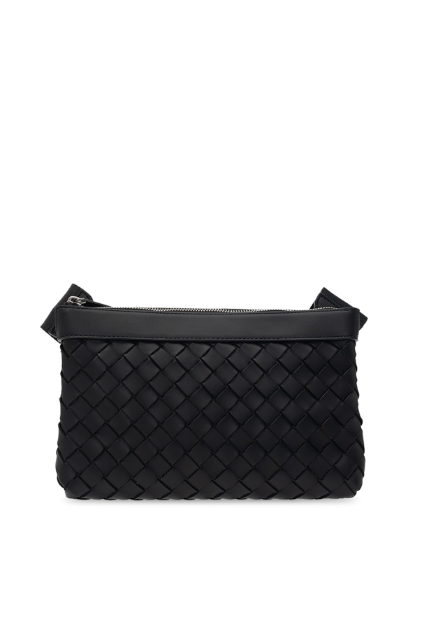 Black ‘Classic Duo’ shoulder bag from Bottega Veneta. Crafted from calf leather with the brand’s signature Intrecciato weave, this model features a zip fastening, two separate compartments with snap buttons, adjustable shoulder strap and silver-tone metal hardware.