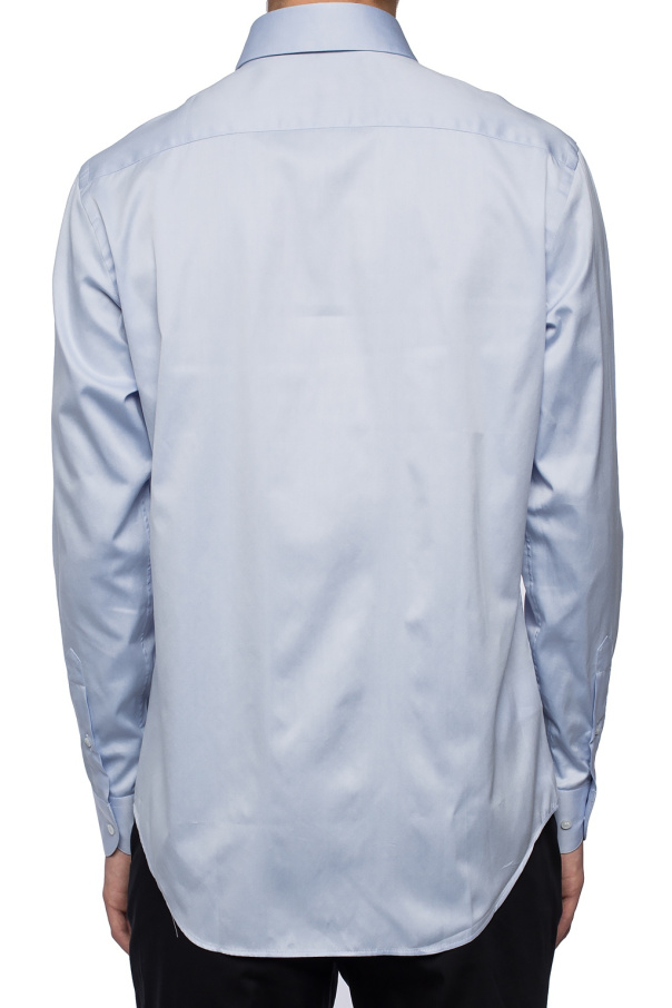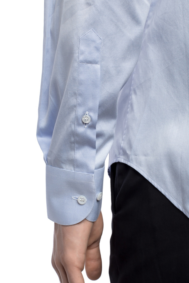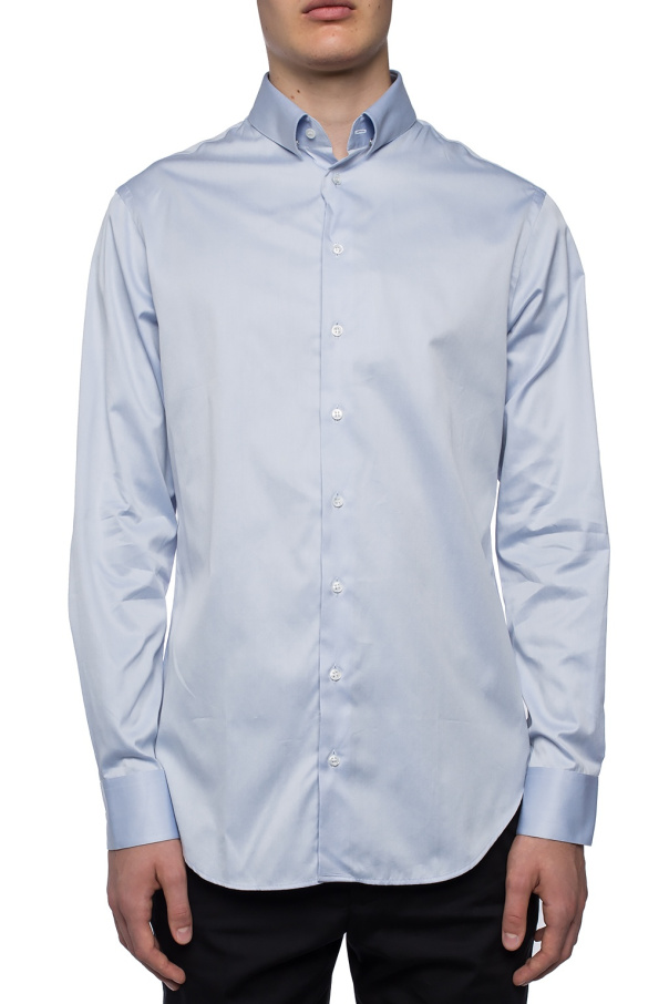 Blue shirt from Giorgio Armani. Made of cotton. Fastened with buttons. Features long sleeves and silver-tone snap closure at collar.