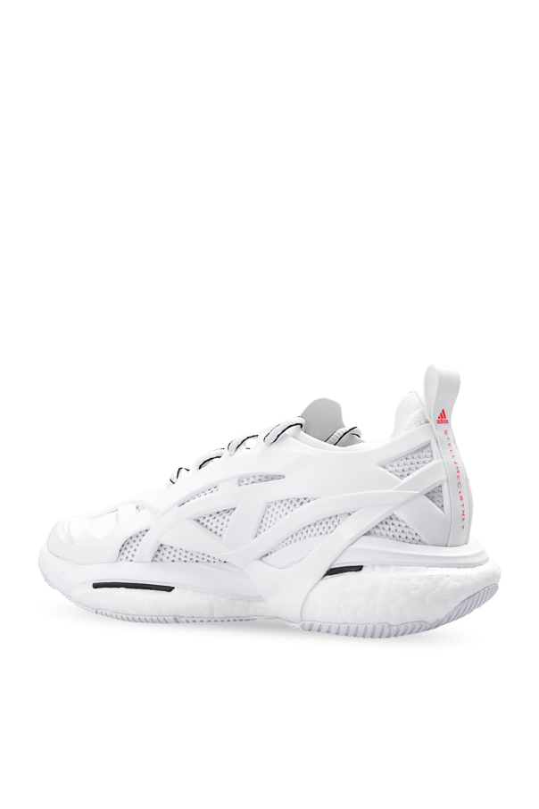 White ‘Solarglide’ running shoes from ADIDAS by Stella McCartney. Fully vegan, this model was crafted from recycled materials and detailed with PRIMEKNIT upper for a perfect fit, rubber inserts and a logo, white BOOST midsole and a white Continental™ rubber outsole.