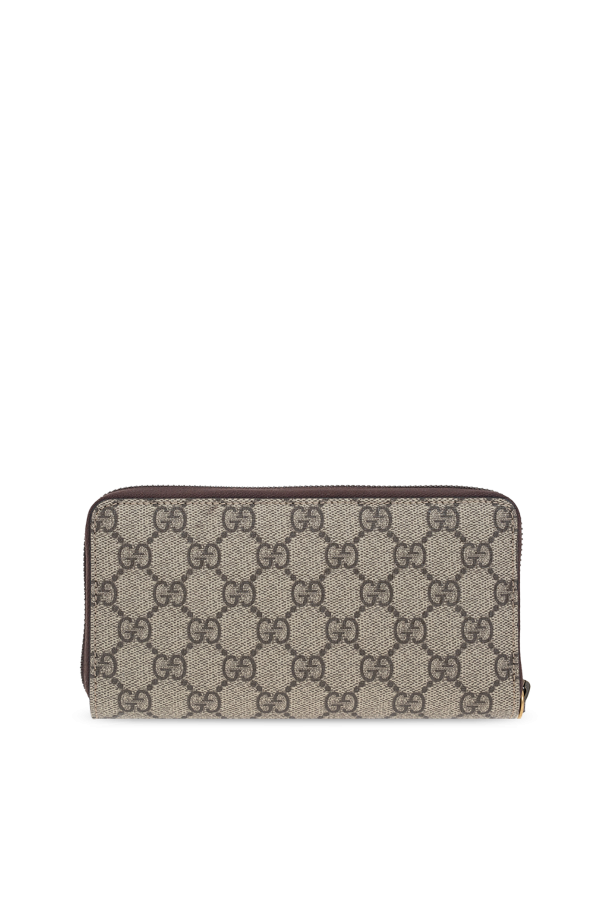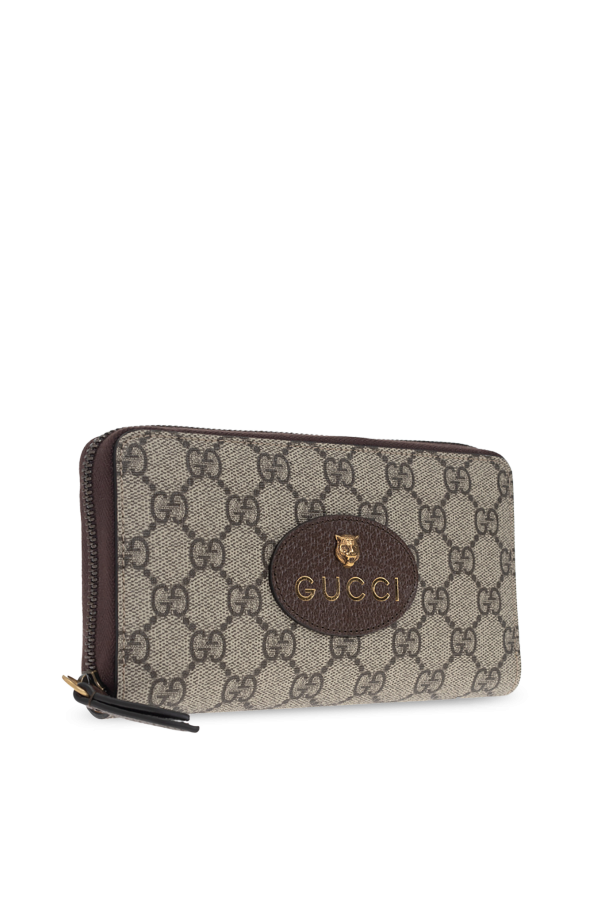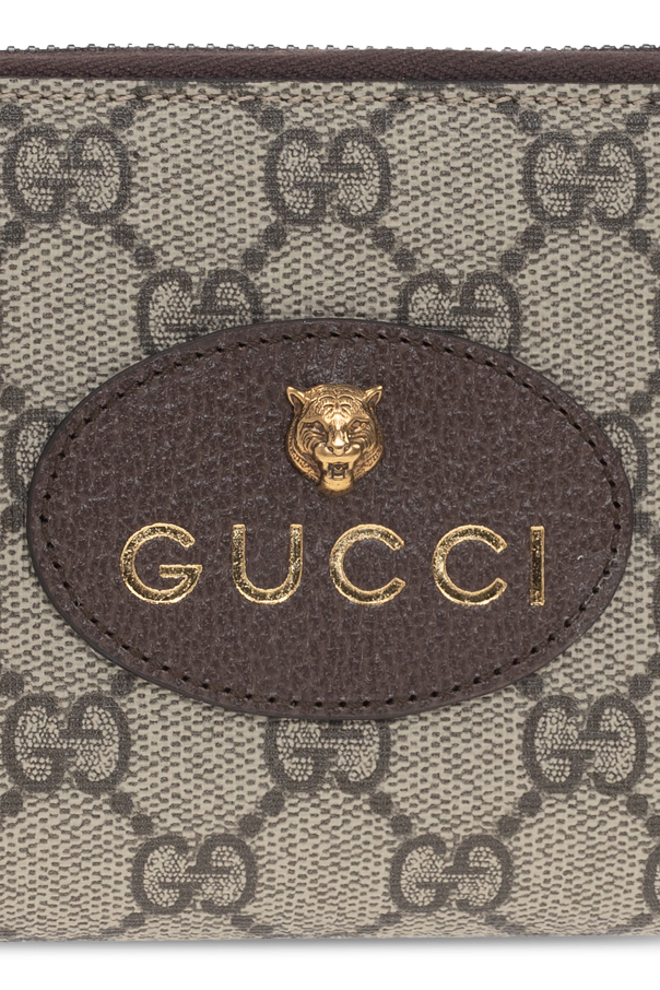 Brown and beige ‘Neo Vintage GG Supreme’ from Gucci. Crafted from ‘GG Supreme’ canvas and finished with leather, this item fastens via a zipper and showcases a gold-tone logo patch and feline hardware on the front as well as a yellow-clad interior with two bill compartments, two slip pockets, fifteen card slots and one zipped coin pocket.