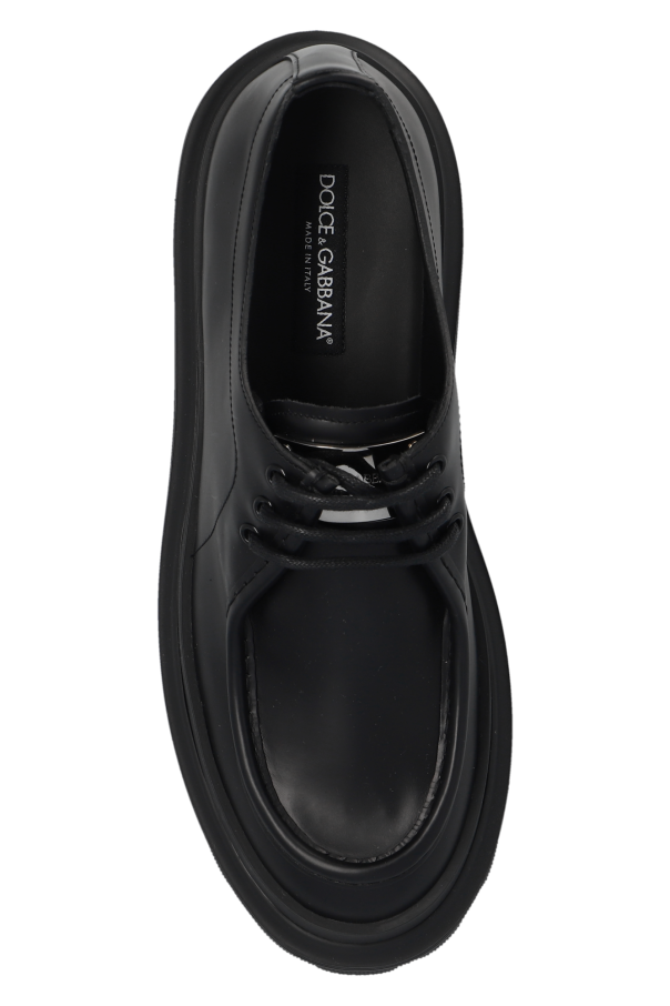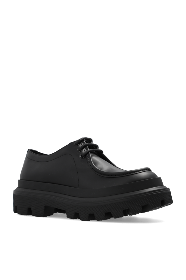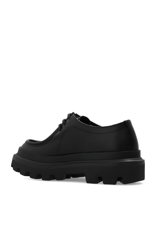 Black ‘Derby’ shoes from Dolce & Gabbana. Crafted from smooth calf leather, this lace-up pair features a silver-tone logo-engraved detail and a black rubber sole.