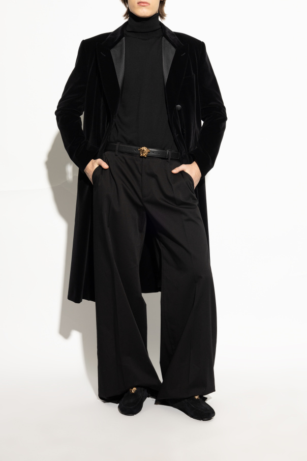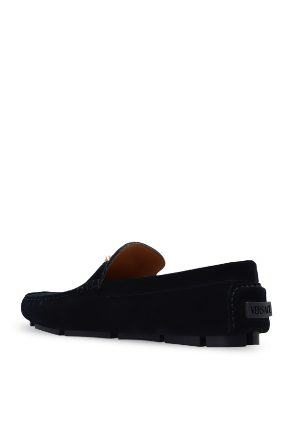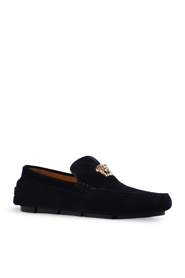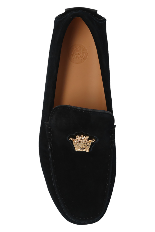 Black ‘La Greca’ moccasins from Versace. Made of suede, this pair features the iconic raised Medusa head in gold-tone, rubber logo patch and black rubber sole.