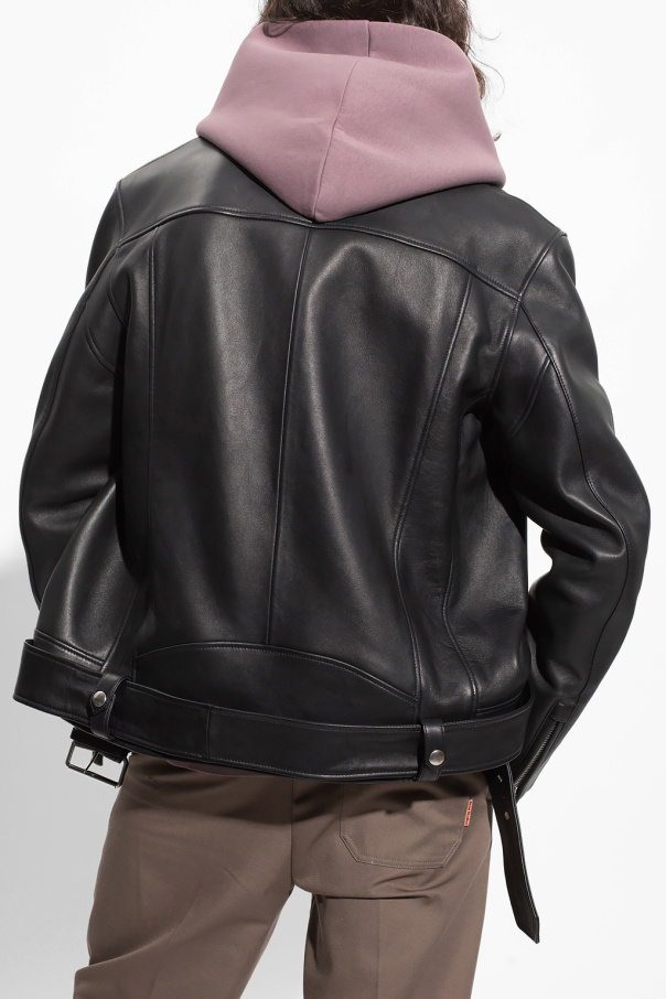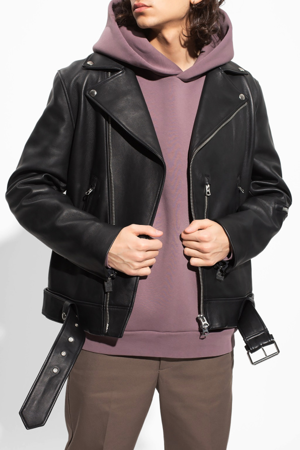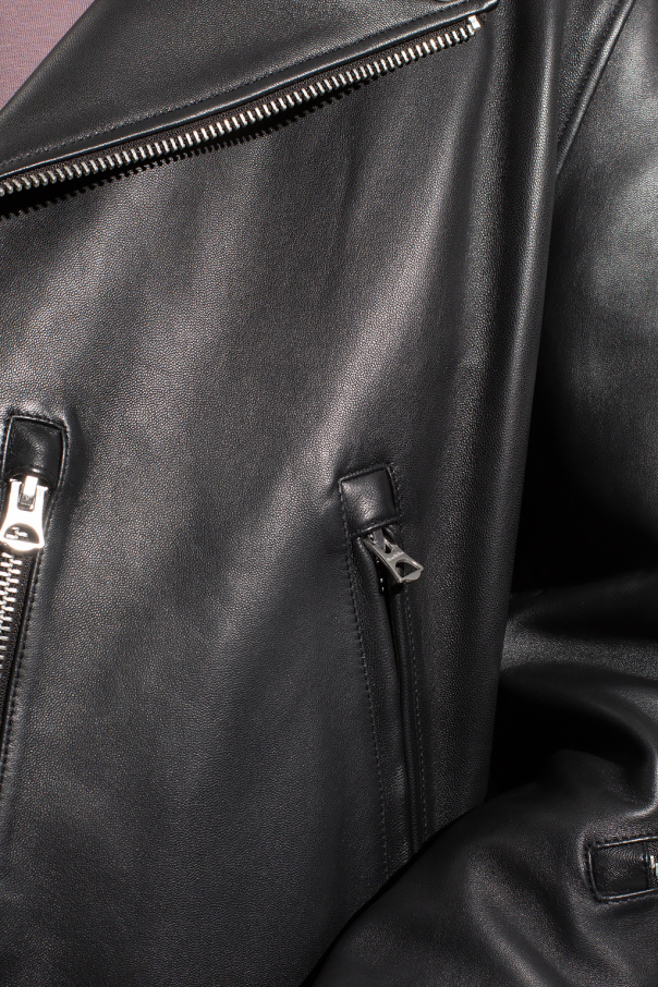Black jacket from Acne Studios. Crafted from lamb leather, this style features a zip fastening, notch lapels, long sleeves and three zipped pockets.
