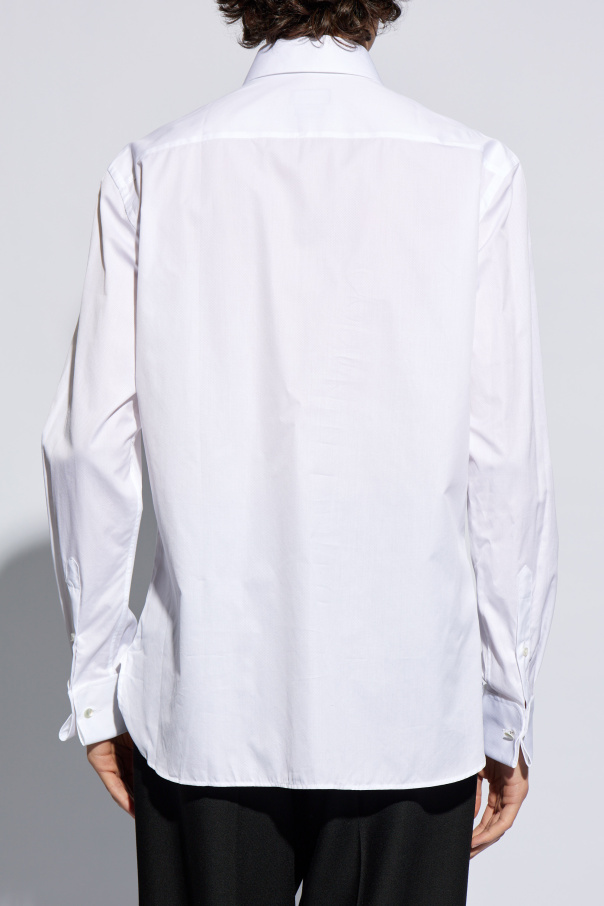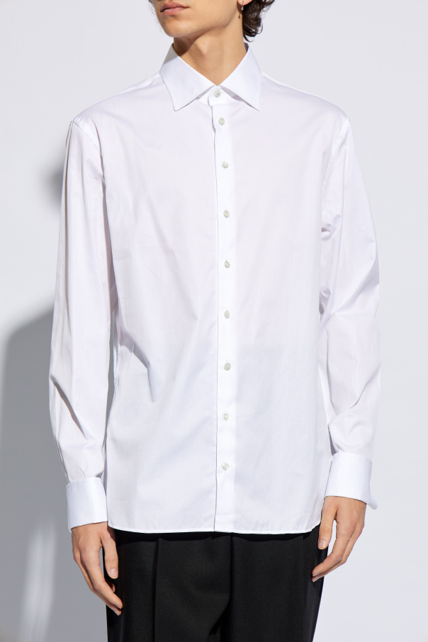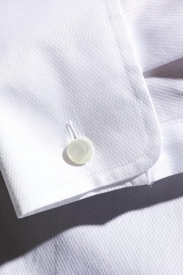 White shirt from Giorgio Armani. Crafted from cotton with a distinctive texture, this style features button fastenings and long sleeves with button cuffs.