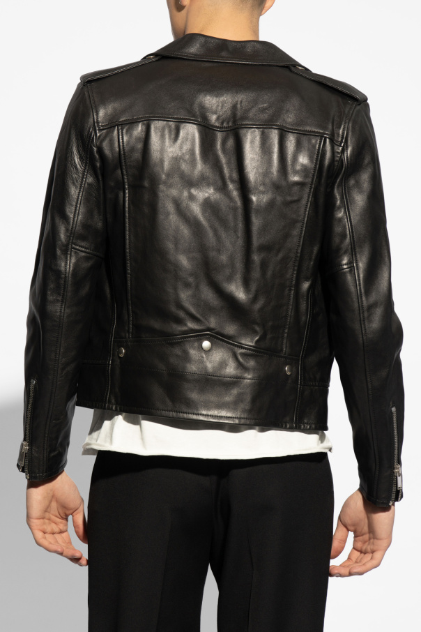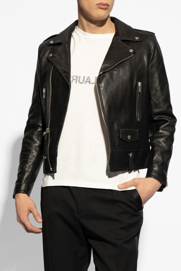 Black padded biker jacket from Saint Laurent. Made of lamb leather. Fastened with zip. Features 3 zip pockets and 1 snap fastening flap pocket at front, zippered cuffs and silver-tone metal hardware.