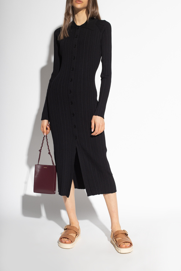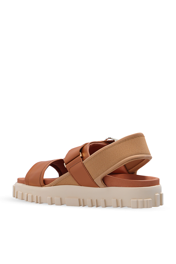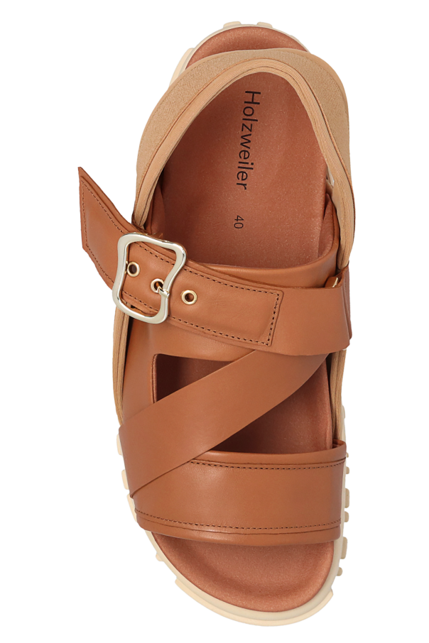 Brown ‘National’ sandals from Holzweiler. Crafted from leather with fabric trims, this pair features a strap with a gold-tone buckle, anti-skid insole and black rubber sole.