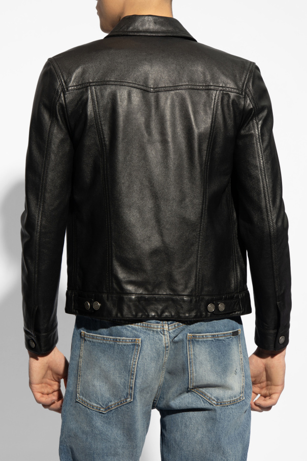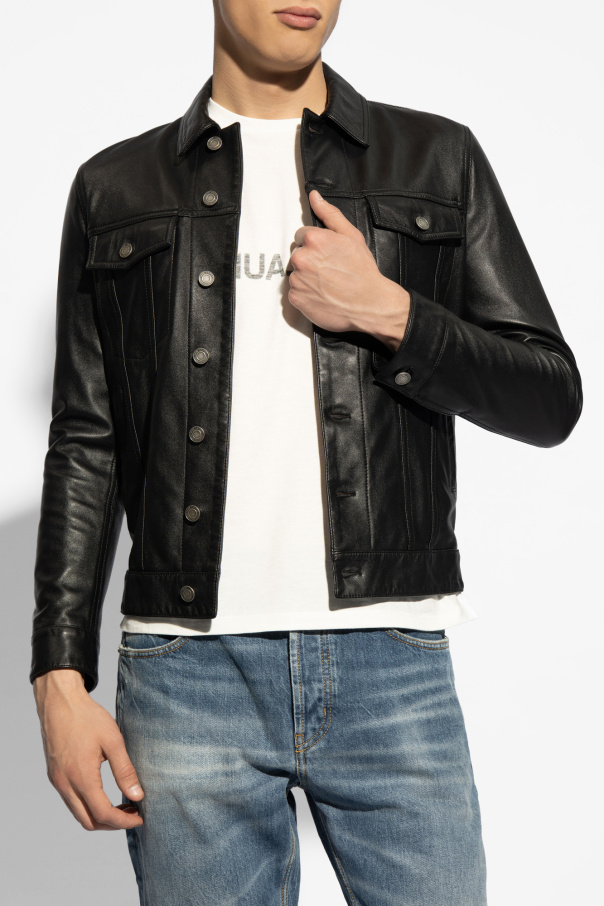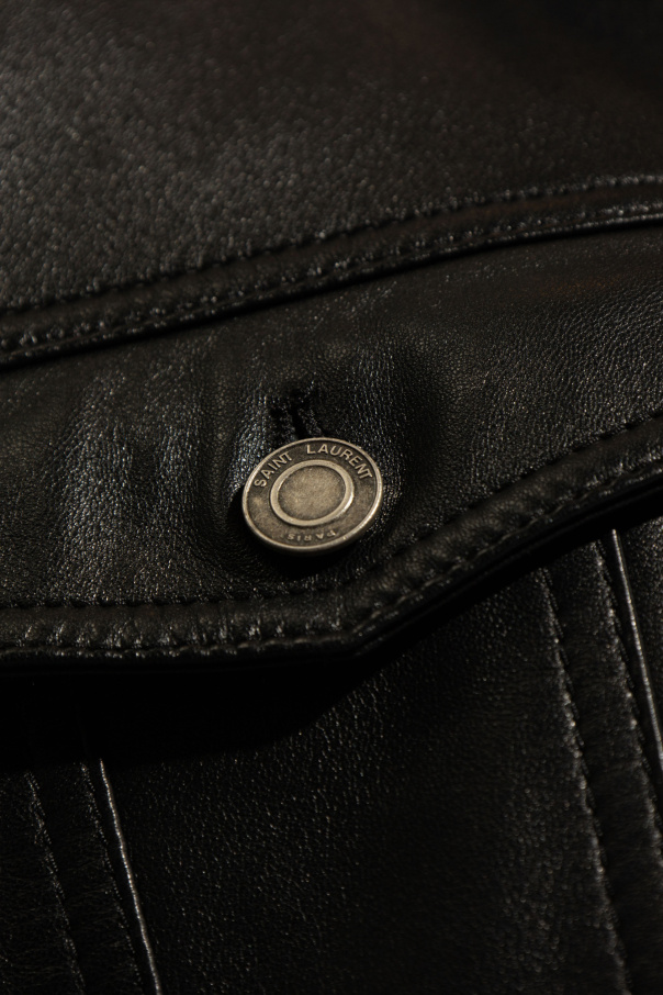 Black jacket from Saint Laurent. Made of leather. Button fastening. Two slip pockets and two flap pockets fastened with buttons on the front. Long sleeves.