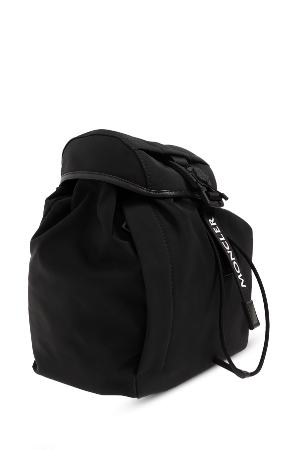 Black ‘Trick’ backpack from Moncler. Emblazoned with a white logo, this design features an adjustable strap with a magnetic snap on the flap, one half-round handle, one zip pocket on the front, adjustable shoulder straps, black metal hardware and a drawstring interior with a slip pocket.