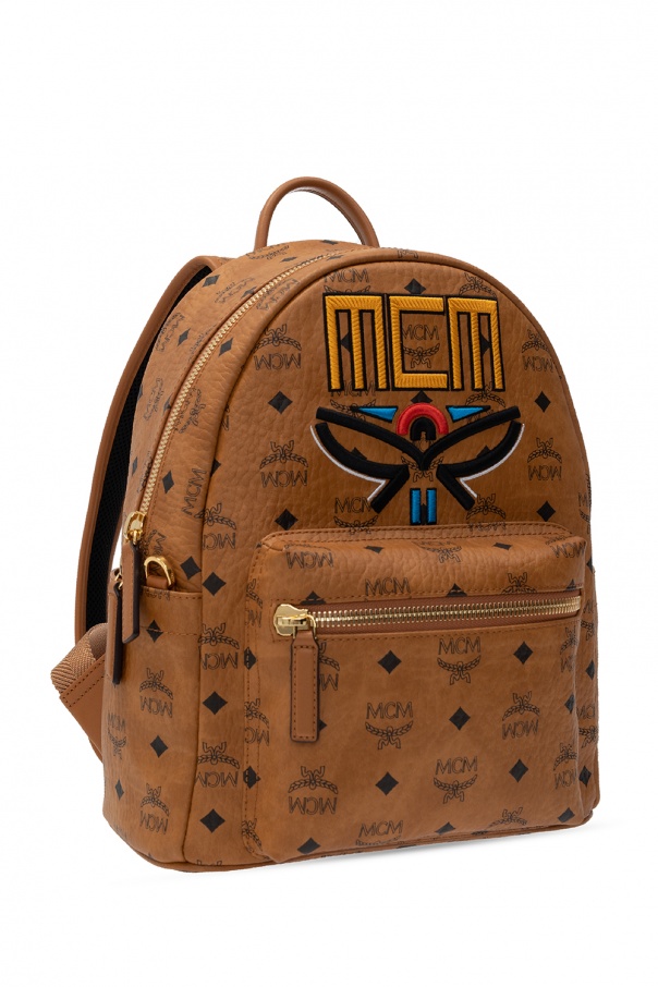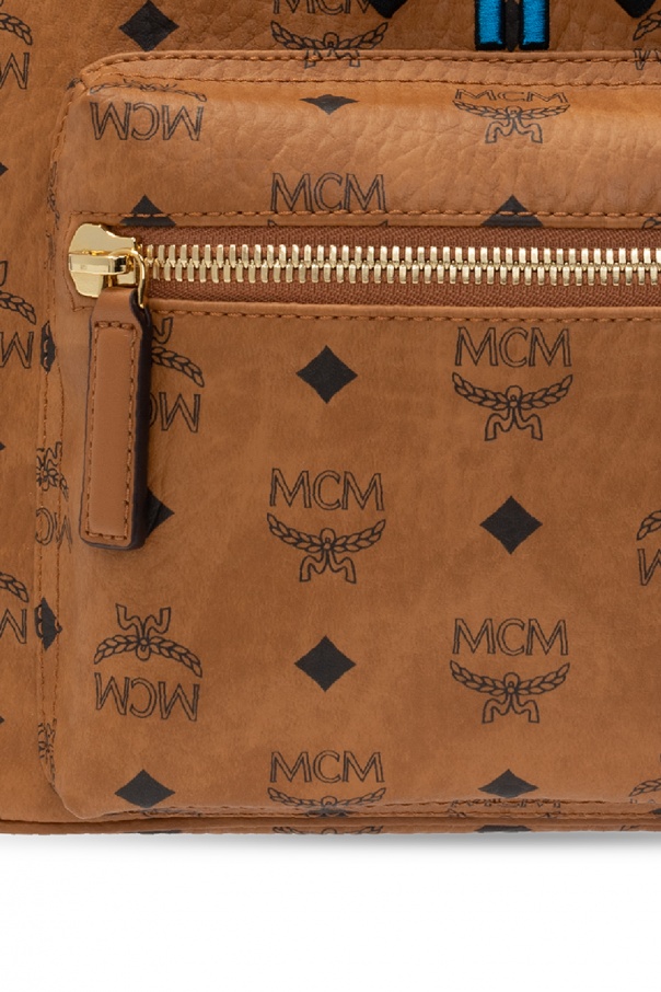 Brown backpack from MCM. Trimmed with leather, this design features a two-way zip fastening, embroidered and printed logo, front zip pocket, two side pockets, adjustable shoulder straps, gold-tone metal hardware and one internal compartment with one slip pocket.