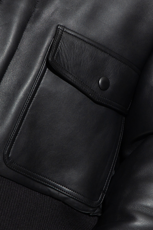Black jacket from Ami Alexandre Mattiussi. Made of lamb leather, this style fastens with a zip and snaps and features a fur-trimmed collar, shoulder epaulettes, two slip pockets, two flapped pockets with snaps, and elasticized trims on the bottom hem and long sleeves.