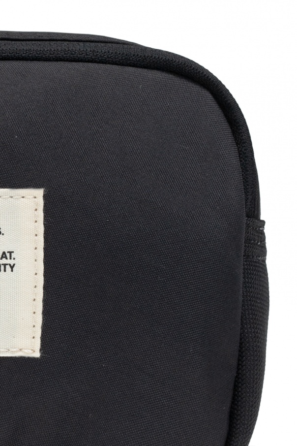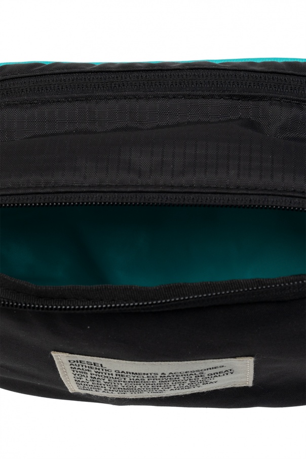 Black wash bag from Diesel. Emblazoned with a beige patch bearing a logo print, this item secures with two zippers and features a half-round handle and two internal compartments.