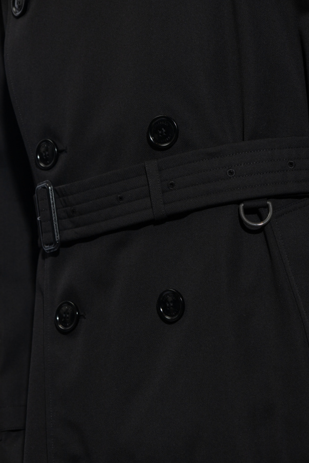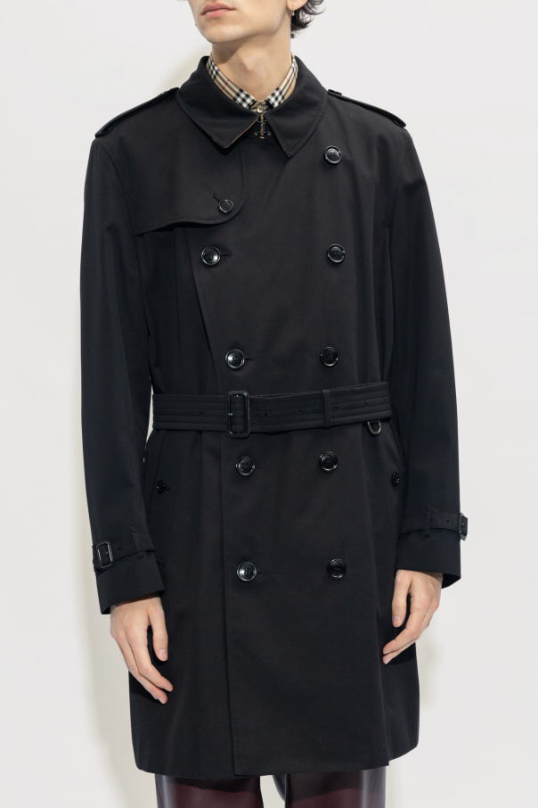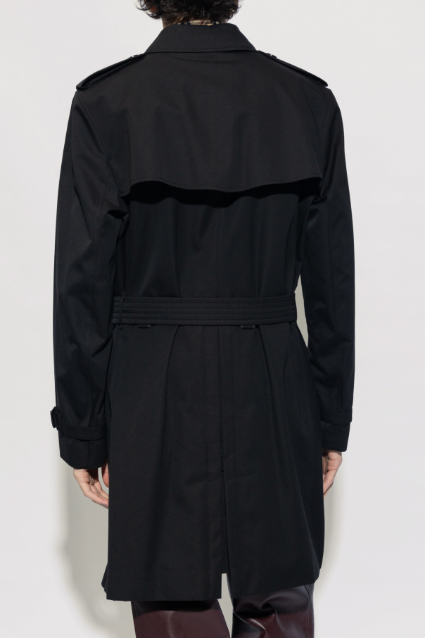 Black trench coat from Burberry. Made of cotton with a double-breasted silhouette, this style features a buckle belt, button fastenings, two slip pockets, shoulder epaulettes and long sleeves.