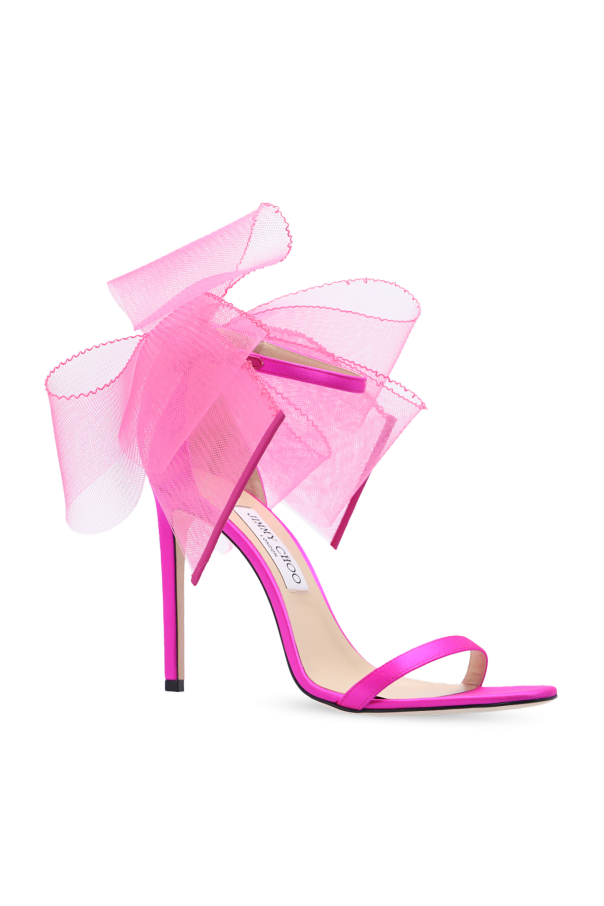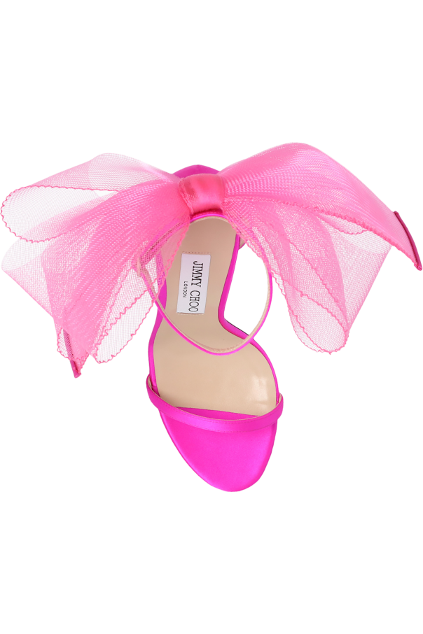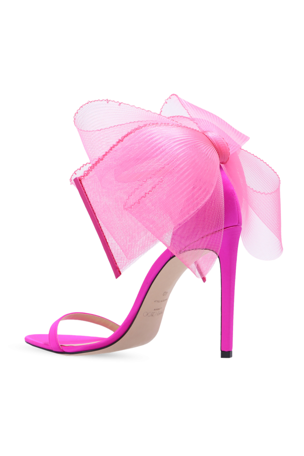 Pink ‘Aveline’ heeled sandals from Jimmy Choo. Made of fabric with a satin-like finish, this model features a buckle ankle strap and asymmetrical appliqués mesh bows.