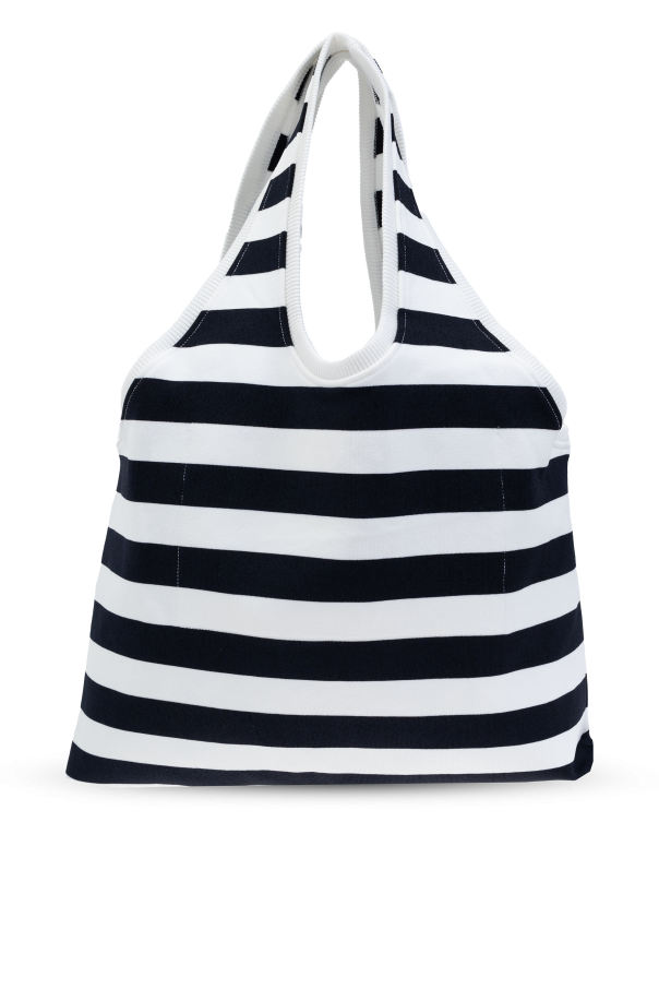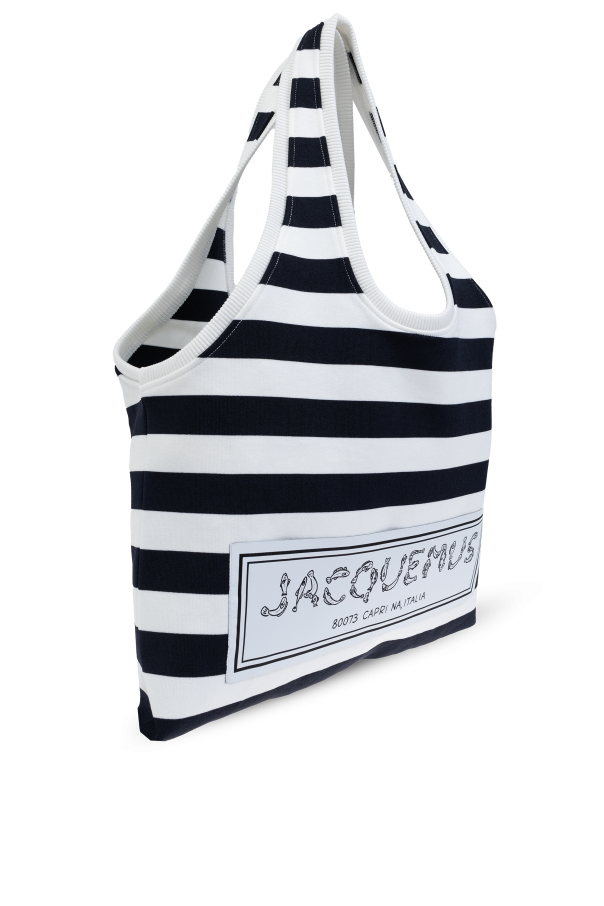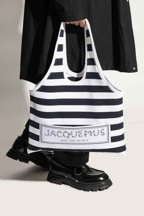 Introducing the "Marcel" shopper bag by Jacquemus, a paragon of effortless elegance and functionality. Crafted with an eye for detail, this bag features a captivating horizontal stripe pattern in a classic navy and white palette, embodying a blend of casual sophistication and timeless style. The bag's rectangular shape, with subtly rounded corners at the base, is designed for the modern individual seeking both style and practicality. The "Marcel" bag boasts a durable fabric construction, ensuring a lightweight yet robust companion for your daily endeavors. Its generously sized handles are crafted from the same high-quality material, allowing for comfortable shoulder wear. The front of the bag is adorned with a white panel showcasing the Jacquemus name and the intriguing detail "8079S CAPRI NA ITALIA", hinting at its prestigious origin and adding an exclusive touch to its minimalist design. Though the bag presents an open main compartment, it cleverly conceals an inner slip pocket, enhancing its functionality without compromising its sleek silhouette. The absence of external pockets and closures accentuates its streamlined appearance, making it an impeccable choice for a variety of outfits, from casual to more refined looks. Why Purchase the "Marcel" Shopper Bag? Timeless Design: Classic navy and white stripes offer endless styling possibilities. Exclusive Details: The elegant script and unique identifier on the front panel signify the bag's luxurious heritage and unique character. Functional Elegance: A spacious main compartment along with an inner slip pocket caters to your everyday needs while maintaining a chic aesthetic. Versatile Wear: Designed for comfort, the long handles allow for effortless shoulder wear, adapting to your lifestyle.